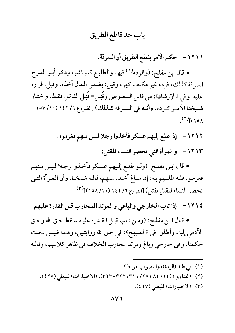 - قال ابن مفلح: (والردء (¬١) فيها والطليع كمباشر، وذكر أبو الفرج السرقة كذلك، فردء غير مكلف كهو، وقيل: يضمن المال آخذه، وقيل: قراره عليه. وفي «الإرشاد»: من قاتل اللصوص وقُتِل= قُتِل القاتل فقط. واختار شيخنا الآمر كردء، وأنه في السرقة كذلك) [الفروع ٦/ ١٤٢ (١٠/ ١٥٧ - ١٥٨)] (¬٢).