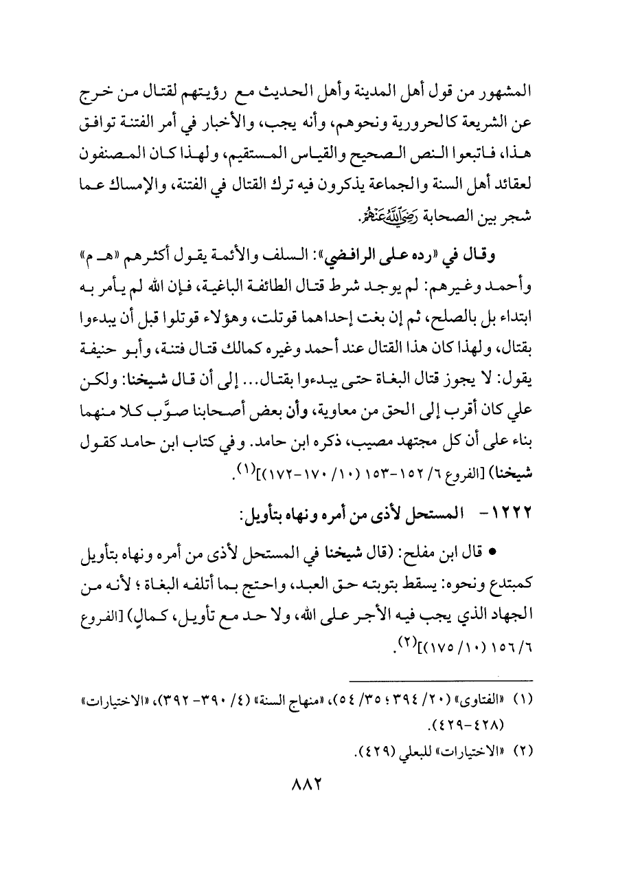 المشهور من قول أهل المدينة وأهل الحديث مع رؤيتهم لقتال من خرج عن الشريعة كالحرورية ونحوهم، وأنه يجب، والأخبار في أمر الفتنة توافق هذا، فاتبعوا النص الصحيح والقياس المستقيم، ولهذا كان المصنفون لعقائد أهل السنة والجماعة يذكرون فيه ترك القتال في الفتنة، والإمساك عما شجر بين الصحابة - رضي الله عنهم -.