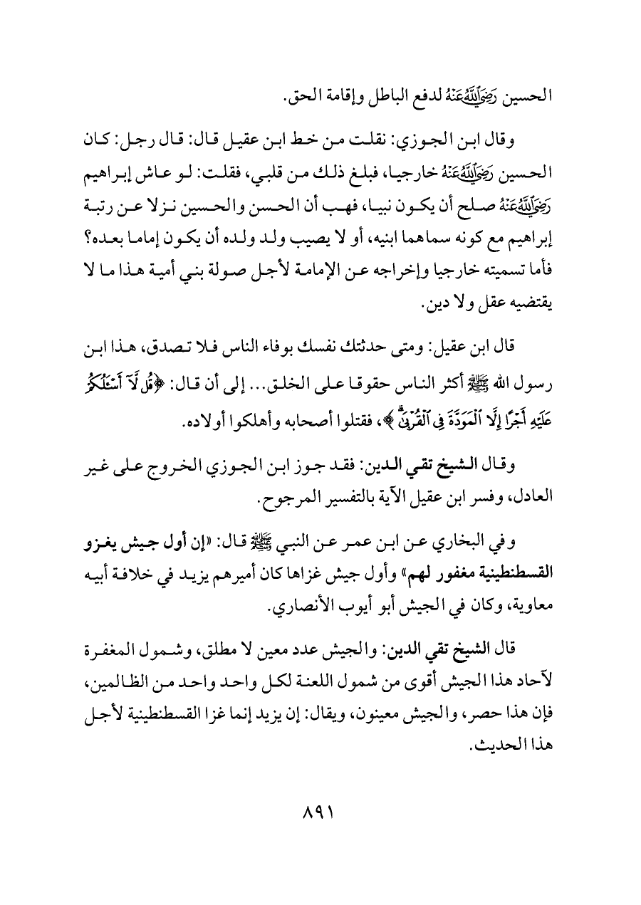 وقال ابن الجوزي: نقلت من خط ابن عقيل قال: قال رجل: كان الحسين - رضي الله عنه - خارجيا، فبلغ ذلك من قلبي، فقلت: لو عاش إبراهيم - رضي الله عنه - صلح أن يكون نبيا، فهب أن الحسن والحسين نزلا عن رتبة إبراهيم مع كونه سماهما ابنيه، أو لا يصيب ولد ولده أن يكون إماما بعده؟ فأما تسميته خارجيا وإخراجه عن الإمامة لأجل صولة بني أمية هذا ما لا يقتضيه عقل ولا دين.