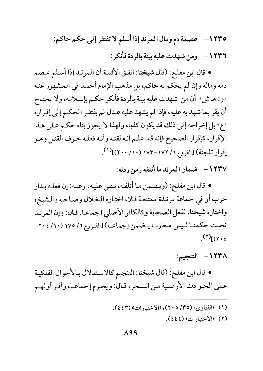 - قال ابن مفلح: (قال شيخنا: اتفق الأئمة أن المرتد إذا أسلم عصم دمه وماله وإن لم يحكم به حاكم، بل مذهب الإمام أحمد في المشهور عنه «و: هـ ش» أن من شهدت عليه بينة بالردة فأنكر حكم بإسلامه، ولا يحتاج أن يقر بما شهد به عليه، فإذا لم يشهد عليه عدل لم يفتقر الحكم إلى إقراره «ع» بل إخراجه إلى ذلك قد يكون كذبا، ولهذا لا يجوز بناء حكم على هذا الإقرار، كإقرار الصحيح فإنه قد علم أنه لقنه وأنه فعله خوف القتل وهو إقرار تلجئة) [الفروع ٦/ ١٧٢ - ١٧٣ (١٠/ ٢٠٠)] (¬١).
