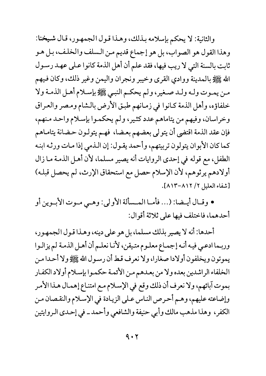 والثانية: لا يحكم بإسلامه بذلك، وهذا قول الجمهور، قال شيخنا: وهذا القول هو الصواب، بل هو إجماع قديم من السلف والخلف، بل هو ثابت بالسنة التي لا ريب فيها، فقد علم أن أهل الذمة كانوا على عهد رسول الله - صلى الله عليه وسلم - بالمدينة ووادي القرى وخيبر ونجران واليمن وغير ذلك، وكان فيهم من يموت وله ولد صغير، ولم يحكم النبي - صلى الله عليه وسلم - بإسلام أهل الذمة ولا خلفاؤه، وأهل الذمة كانوا في زمانهم طبق الأرض بالشام ومصر والعراق وخراسان، وفيهم من يتاماهم عدد كثير، ولم يحكموا بإسلام واحد منهم، فإن عقد الذمة اقتضى أن يتولى بعضهم بعضا، فهم يتولون حضانة يتاماهم كما كان الأبوان يتولون تربيتهم، وأحمد يقول: إن الذمي إذا مات ورثه ابنه الطفل، مع قوله في إحدى الروايات أنه يصير مسلما، لأن أهل الذمة ما زال أولادهم يرثوهم، لأن الإسلام حصل مع استحقاق الإرث، لم يحصل قبله) [شفاء العليل ٢/ ٨١٢ - ٨١٣].
