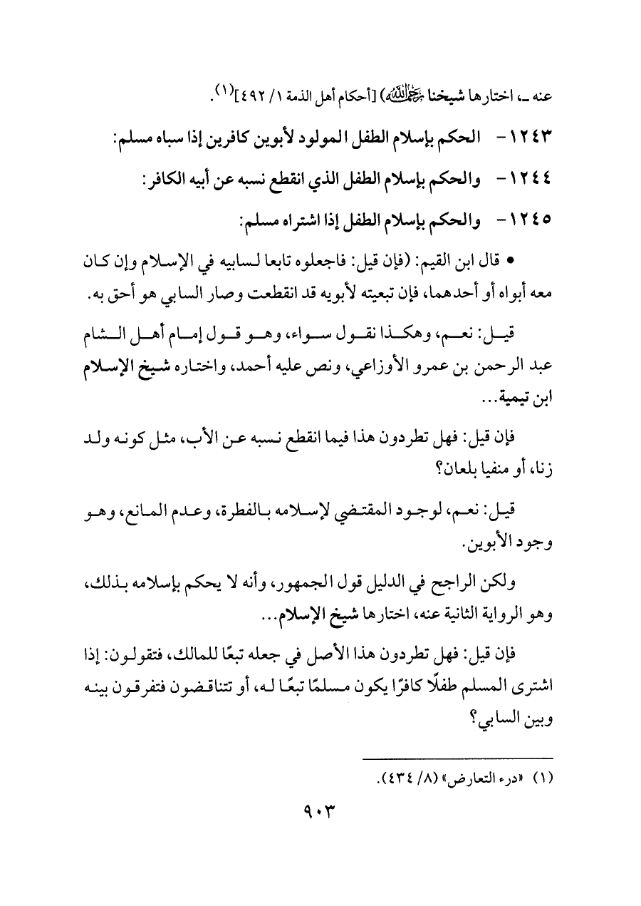 ١٢٤٣ - الحكم بإسلام الطفل المولود لأبوين كافرين إذا سباه مسلم: