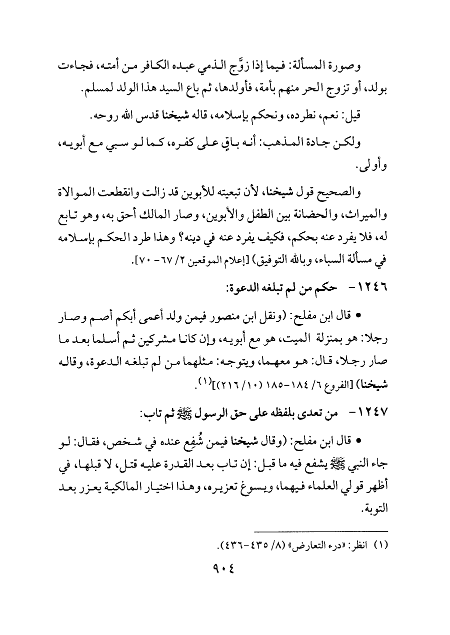 - قال ابن مفلح: (ونقل ابن منصور فيمن ولد أعمى أبكم أصم وصار رجلا: هو بمنزلة الميت، هو مع أبويه، وإن كانا مشركين ثم أسلما بعد ما صار رجلا، قال: هو معهما، ويتوجه: مثلهما من لم تبلغه الدعوة، وقاله شيخنا) [الفروع ٦/ ١٨٤ - ١٨٥ (١٠/ ٢١٦)] (¬١).