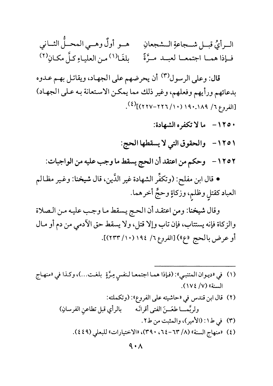 وقال شيخنا: ومن اعتقد أن الحج يسقط ما وجب عليه من الصلاة والزكاة فإنه يستتاب، فإن تاب وإلا قتل، ولا يسقط حق الآدمي من دم أو مال أو عرض بالحج «ع») [الفروع ٦/ ١٩٤ (١٠/ ٢٣٣)].