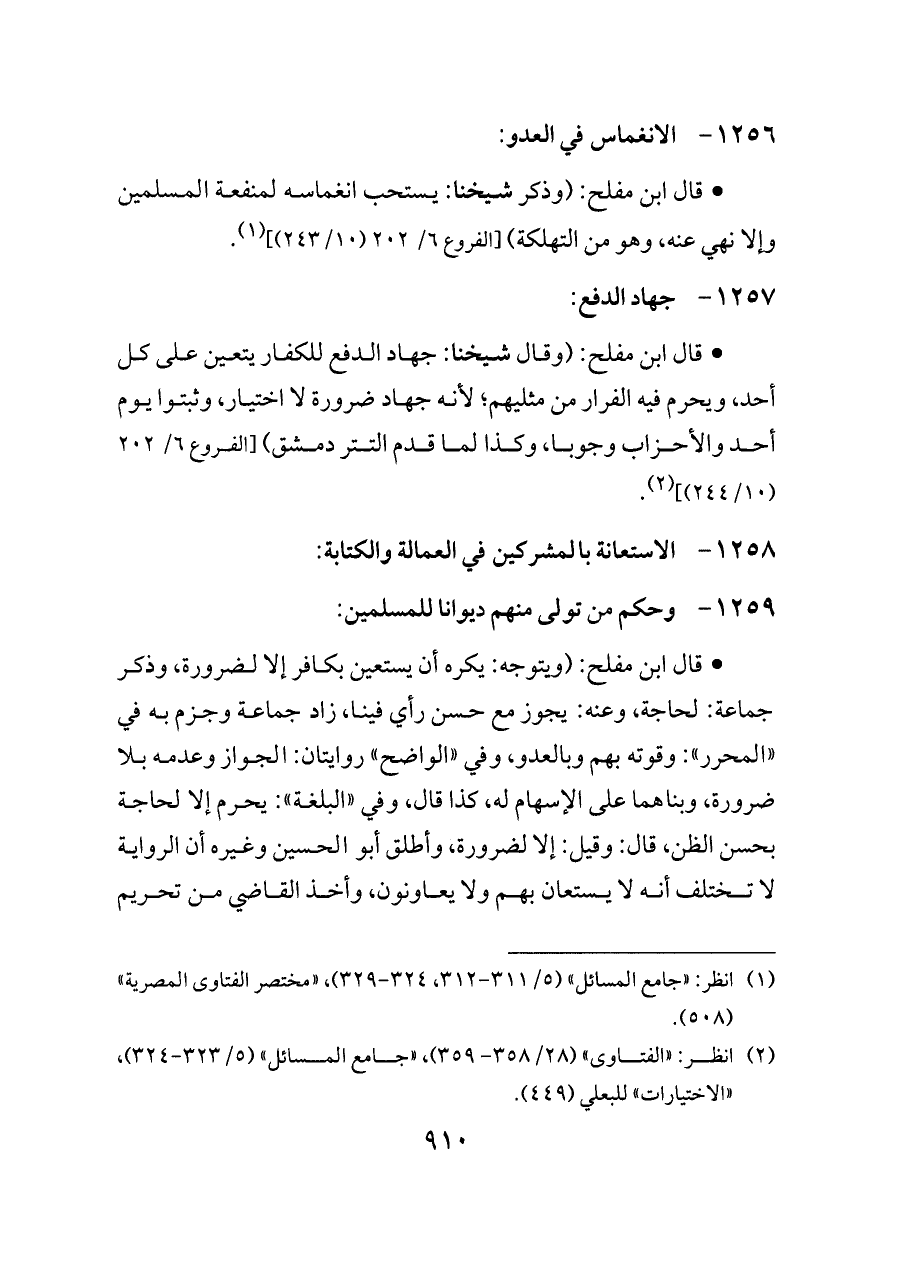 - قال ابن مفلح: (وقال شيخنا: جهاد الدفع للكفار يتعين على كل أحد، ويحرم فيه الفرار من مثليهم؛ لأنه جهاد ضرورة لا اختيار، وثبتوا يوم أحد والأحزاب وجوبا، وكذا لما قدم التتر دمشق) [الفروع ٦/ ٢٠٢ (١٠/ ٢٤٤)] (¬٢).