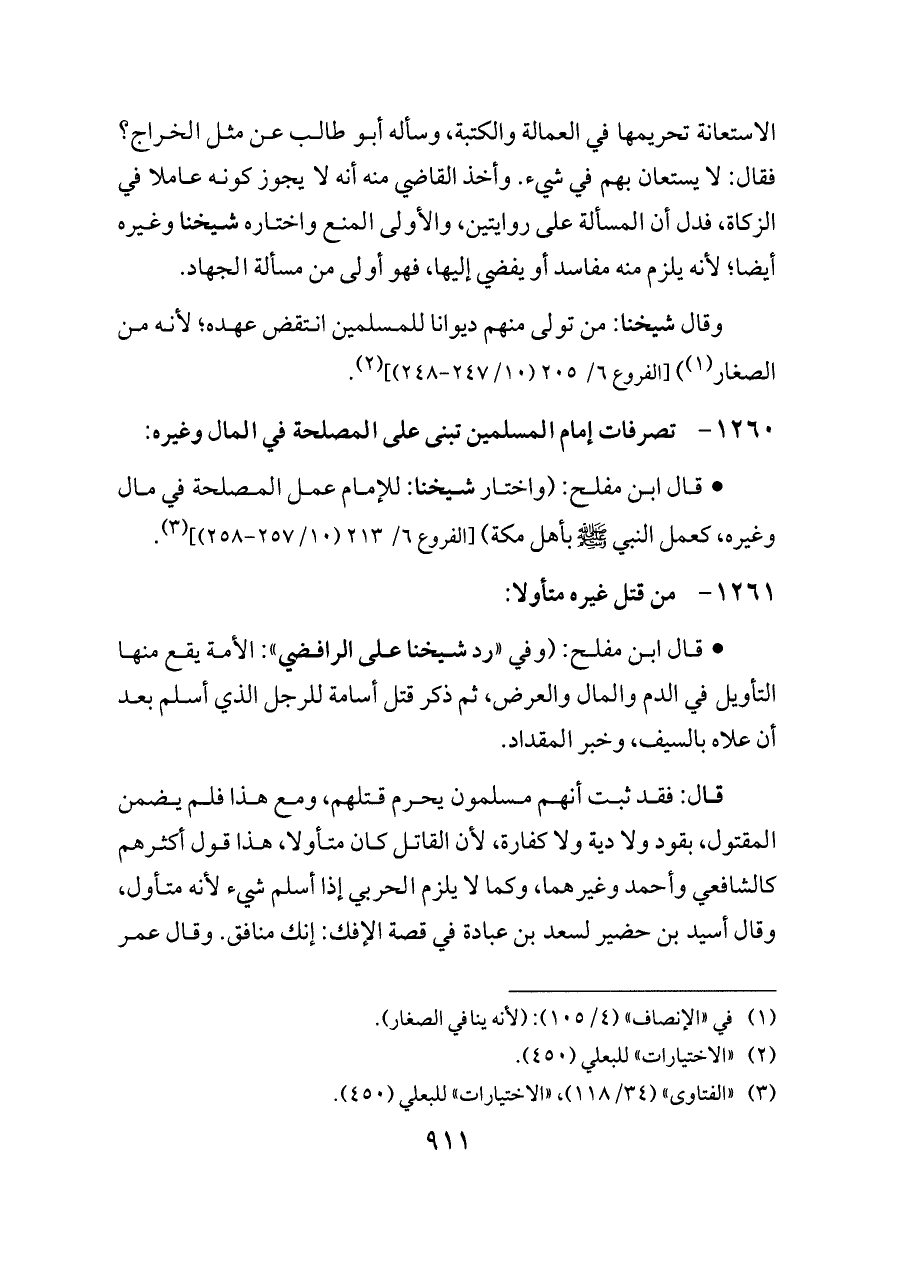 - قال ابن مفلح: (واختار شيخنا: للإمام عمل المصلحة في مال وغيره، كعمل النبي - صلى الله عليه وسلم - بأهل مكة) [الفروع ٦/ ٢١٣ (١٠/ ٢٥٧ - ٢٥٨)] (¬٣).