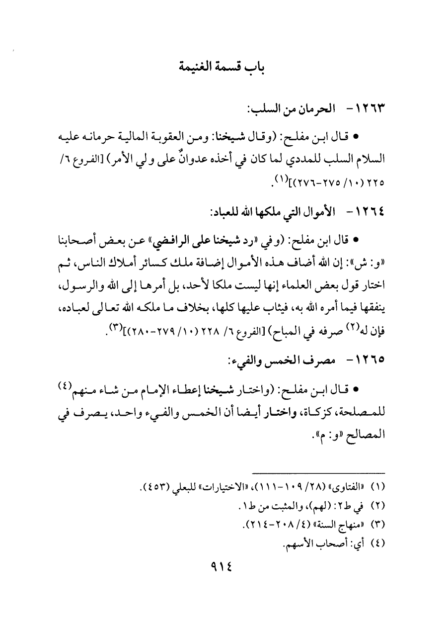 - قال ابن مفلح: (وفي «رد شيخنا على الرافضي» عن بعض أصحابنا «و: ش»: إن الله أضاف هذه الأموال إضافة ملك كسائر أملاك الناس، ثم اختار قول بعض العلماء إنها ليست ملكا لأحد، بل أمرها إلى الله والرسول، ينفقها فيما أمره الله به، فيثاب عليها كلها، بخلاف ما ملكه الله تعالى لعباده، فإن له (¬٢) صرفه في المباح) [الفروع ٦/ ٢٢٨ (١٠/ ٢٧٩ - ٢٨٠)] (¬٣).