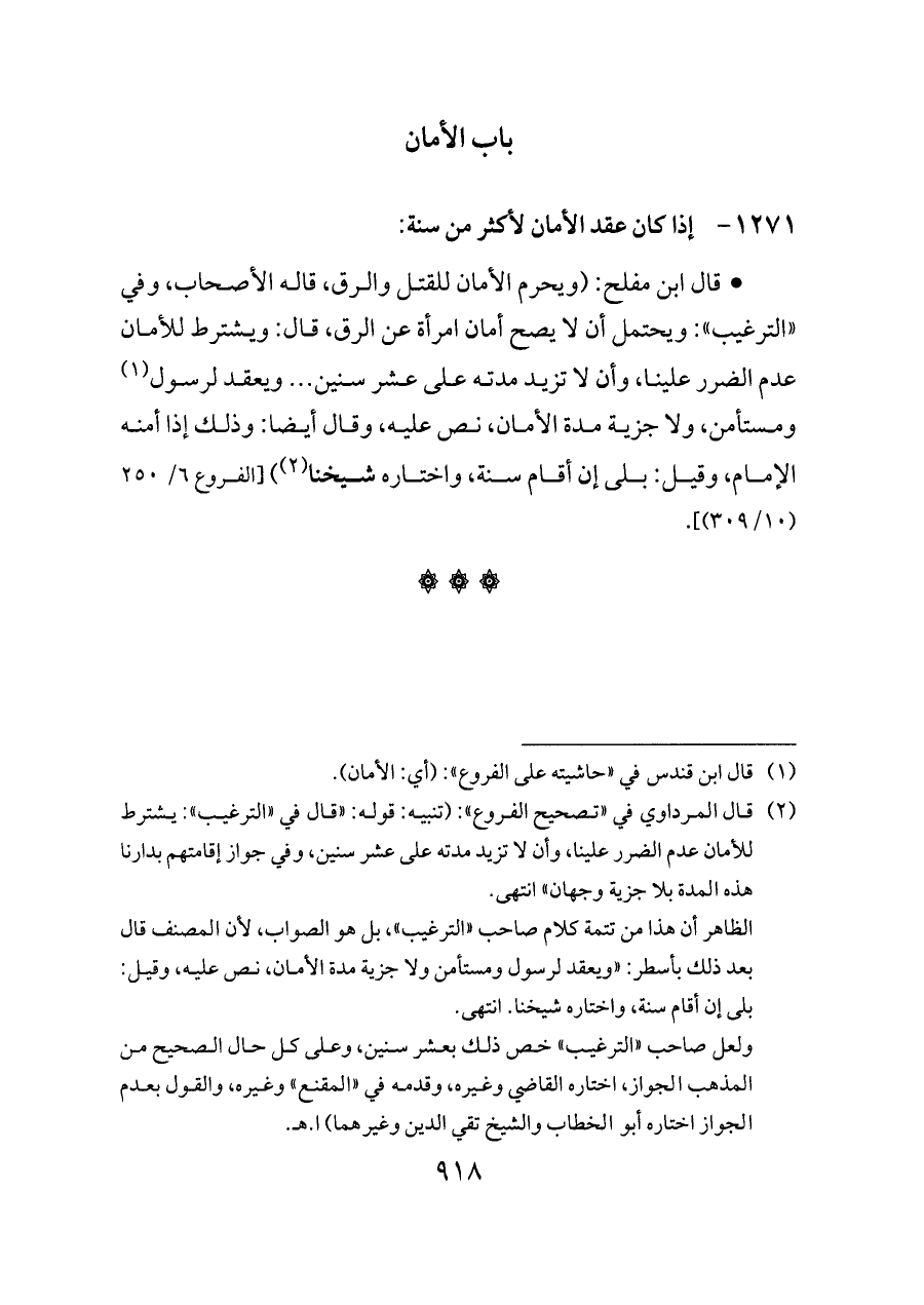 (¬٢) قال المرداوي في «تصحيح الفروع»: (تنبيه: قوله: «قال في «الترغيب»: يشترط للأمان عدم الضرر علينا, وأن لا تزيد مدته على عشر سنين, وفي جواز إقامتهم بدارنا هذه المدة بلا جزية وجهان» انتهى.