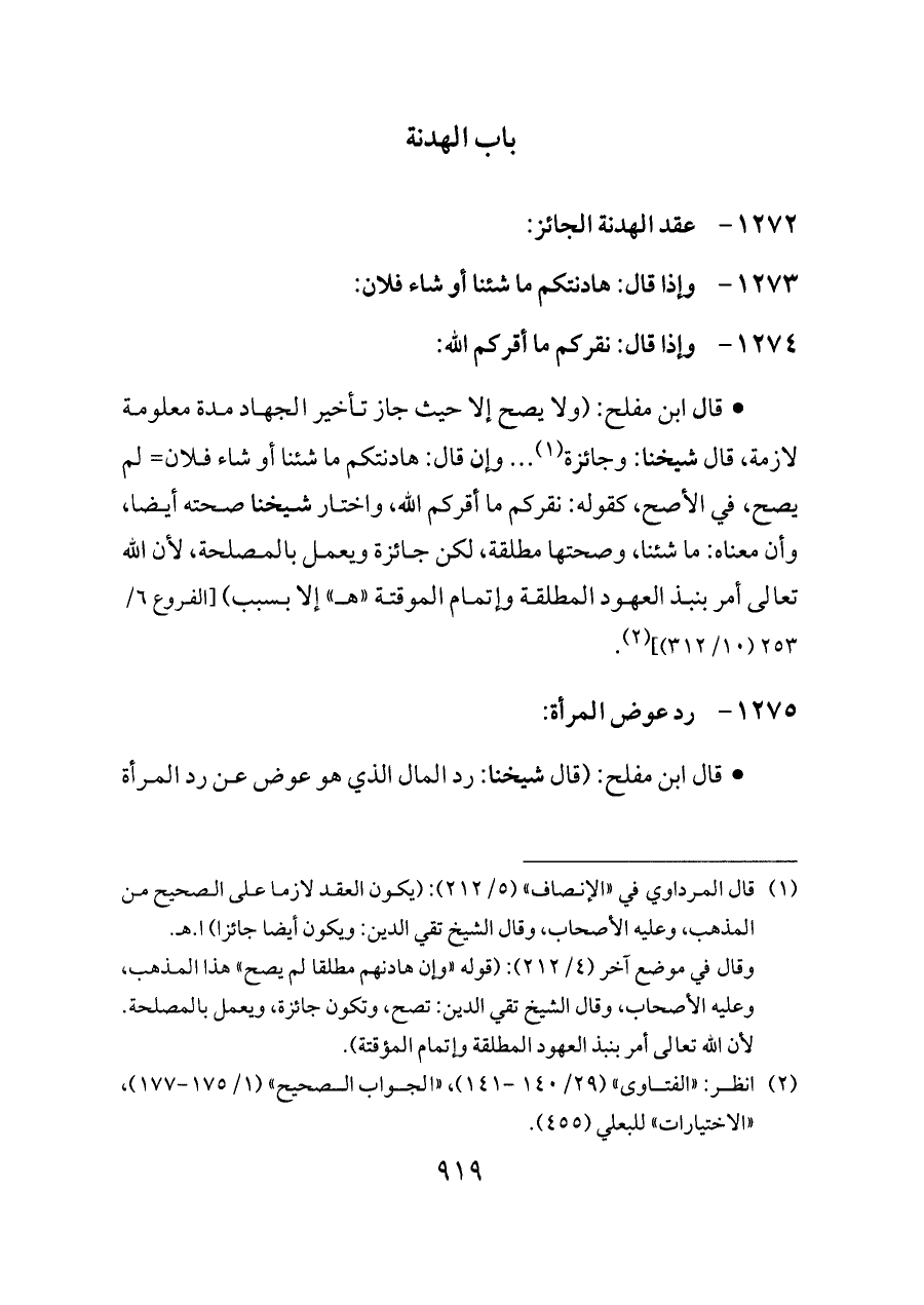 وإن قال: هادنتكم ما شئنا أو شاء فلان= لم يصح، في الأصح، كقوله: نقركم ما أقركم الله، واختار شيخنا صحته أيضا، وأن معناه: ما شئنا، وصحتها مطلقة، لكن جائزة ويعمل بالمصلحة، لأن الله تعالى أمر بنبذ العهود المطلقة وإتمام الموقتة «هـ» إلا بسبب) [الفروع ٦/ ٢٥٣ (١٠/ ٣١٢)] (¬٢).