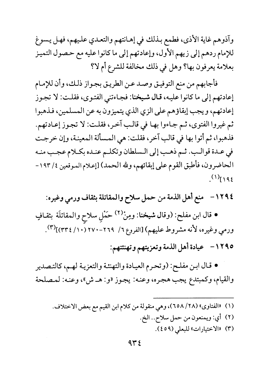 - قال ابن مفلح: (وقال شيخنا: ومِنْ (¬٢) حَمْلِ سلاحٍ والمقاتلَة بثقافٍ ورمي وغيره، لأنه مشروط عليهم) [الفروع ٦/ ٢٦٩ - ٢٧٠ (١٠/ ٣٣٤)] (¬٣).