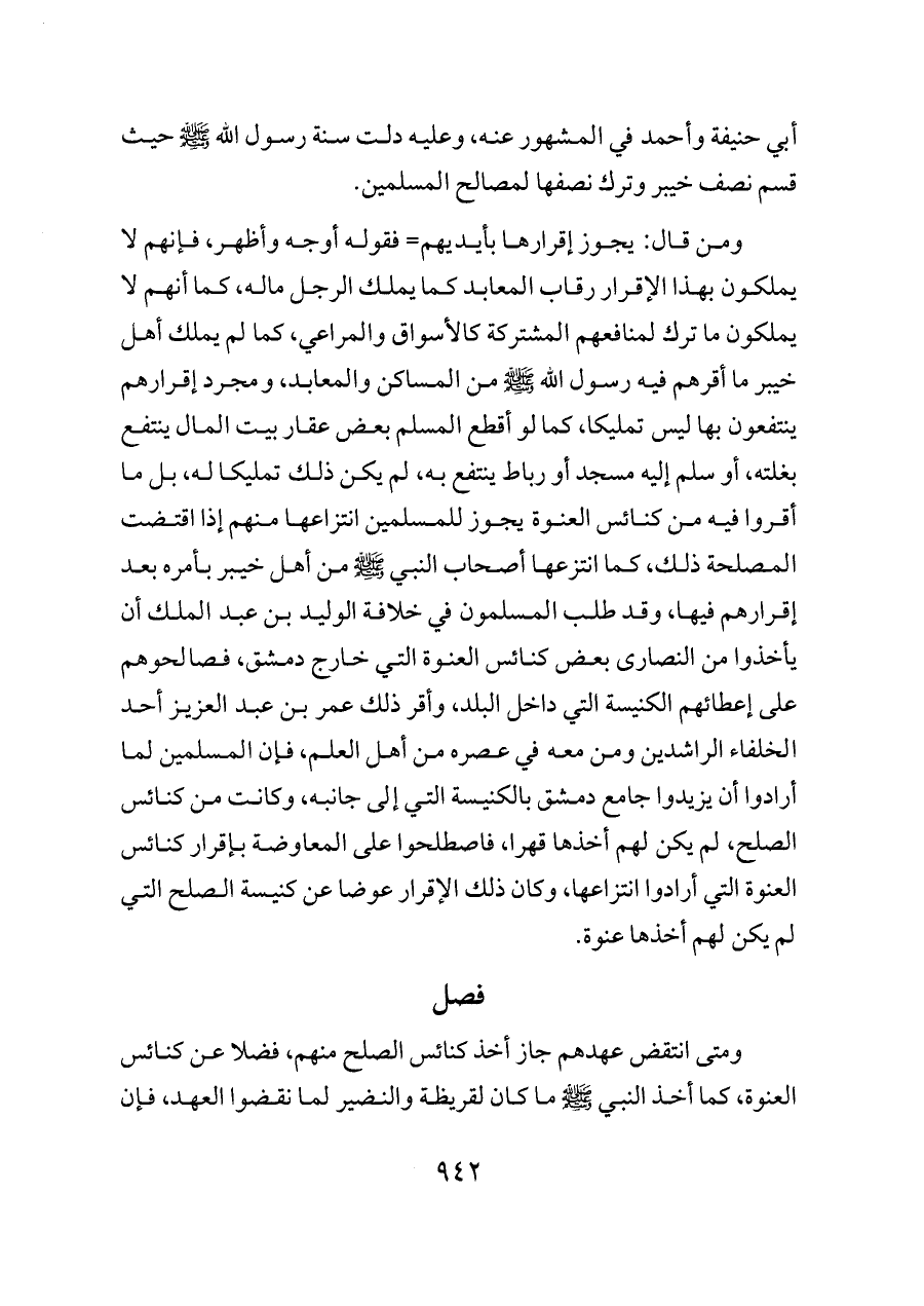 ومن قال: يجوز إقرارها بأيديهم= فقوله أوجه وأظهر، فإنهم لا يملكون بهذا الإقرار رقاب المعابد كما يملك الرجل ماله، كما أنهم لا يملكون ما ترك لمنافعهم المشتركة كالأسواق والمراعي، كما لم يملك أهل خيبر ما أقرهم فيه رسول الله - صلى الله عليه وسلم - من المساكن والمعابد، ومجرد إقرارهم ينتفعون بها ليس تمليكا، كما لو أقطع المسلم بعض عقار بيت المال ينتفع بغلته، أو سلم إليه مسجد أو رباط ينتفع به، لم يكن ذلك تمليكا له، بل ما أقروا فيه من كنائس العنوة يجوز للمسلمين انتزاعها منهم إذا اقتضت المصلحة ذلك، كما انتزعها أصحاب النبي - صلى الله عليه وسلم - من أهل خيبر بأمره بعد إقرارهم فيها، وقد طلب المسلمون في خلافة الوليد بن عبد الملك أن يأخذوا من النصارى بعض كنائس العنوة التي خارج دمشق، فصالحوهم على إعطائهم الكنيسة التي داخل البلد، وأقر ذلك عمر بن عبد العزيز أحد الخلفاء الراشدين ومن معه في عصره من أهل العلم، فإن المسلمين لما أرادوا أن يزيدوا جامع دمشق بالكنيسة التي إلى جانبه، وكانت من كنائس الصلح، لم يكن لهم أخذها قهرا، فاصطلحوا على المعاوضة بإقرار كنائس العنوة التي أرادوا انتزاعها، وكان ذلك الإقرار عوضا عن كنيسة الصلح التي لم يكن لهم أخذها عنوة.