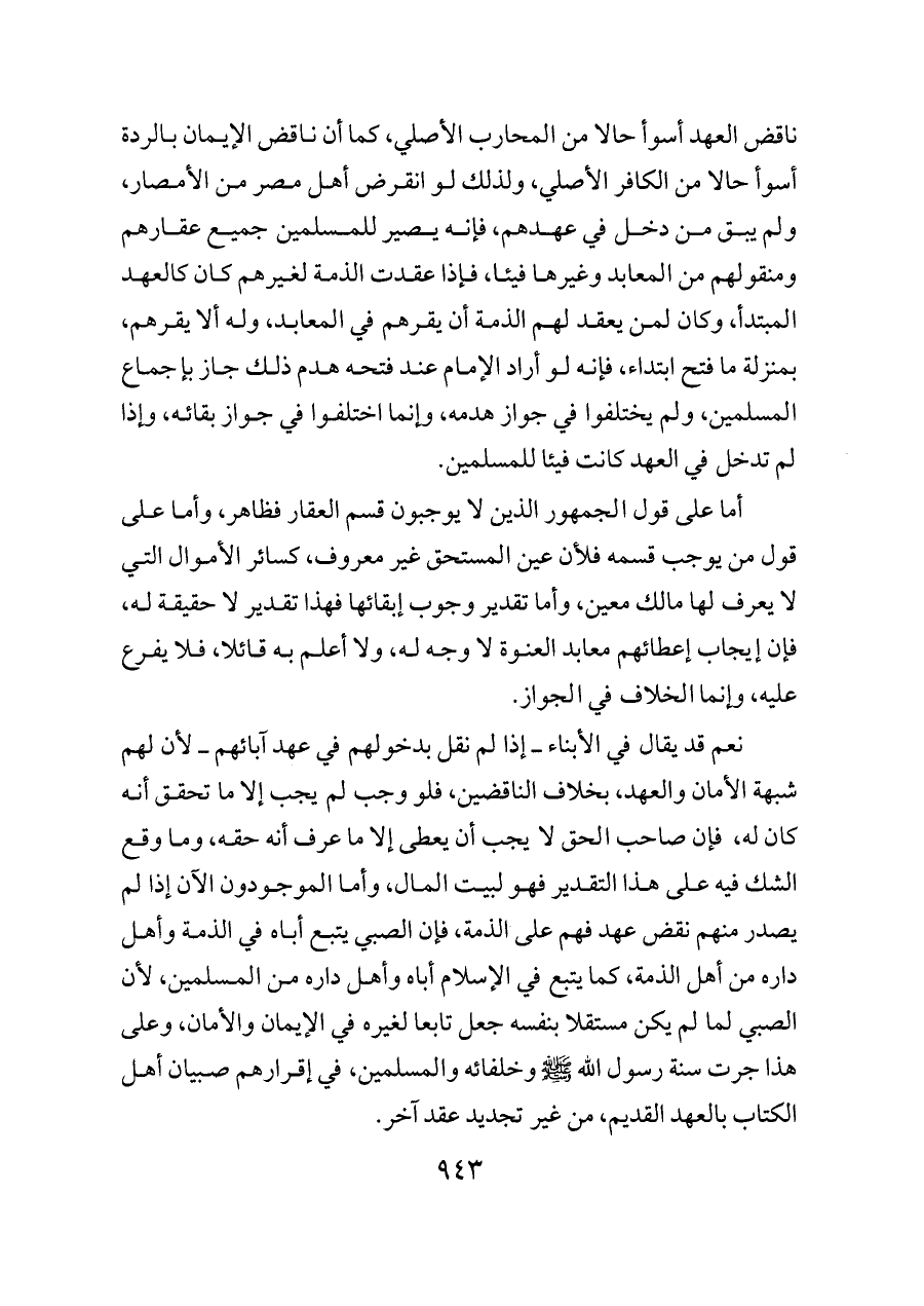 نعم قد يقال في الأبناء ــ إذا لم نقل بدخولهم في عهد آبائهم ــ لأن لهم شبهة الأمان والعهد، بخلاف الناقضين، فلو وجب لم يجب إلا ما تحقق أنه كان له، فإن صاحب الحق لا يجب أن يعطى إلا ما عرف أنه حقه، وما وقع الشك فيه على هذا التقدير فهو لبيت المال، وأما الموجودون الآن إذا لم يصدر منهم نقض عهد فهم على الذمة، فإن الصبي يتبع أباه في الذمة وأهل داره من أهل الذمة، كما يتبع في الإسلام أباه وأهل داره من المسلمين، لأن الصبي لما لم يكن مستقلا بنفسه جعل تابعا لغيره في الإيمان والأمان، وعلى هذا جرت سنة رسول الله - صلى الله عليه وسلم - وخلفائه والمسلمين، في إقرارهم صبيان أهل الكتاب بالعهد القديم، من غير تجديد عقد آخر.