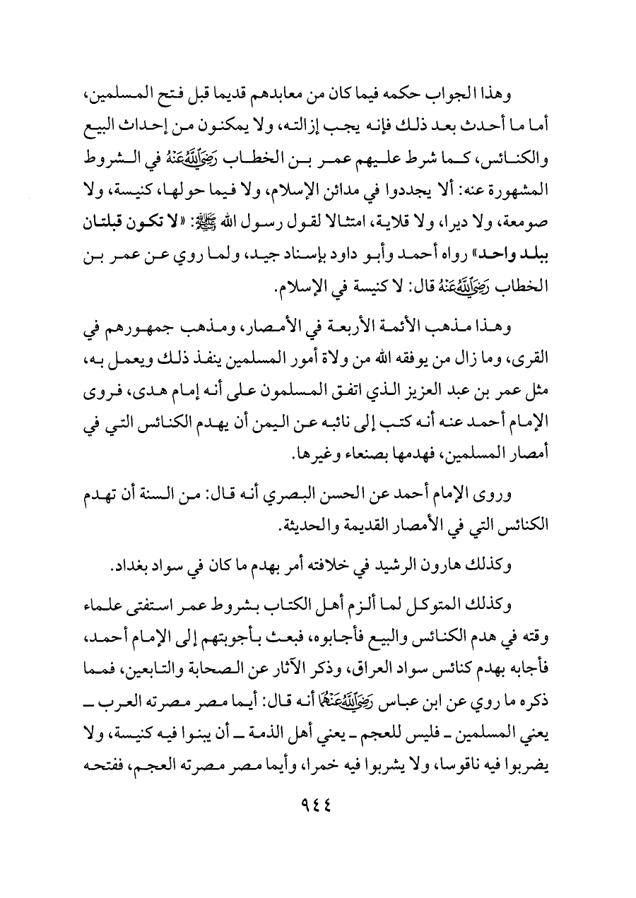 وكذلك المتوكل لما ألزم أهل الكتاب بشروط عمر استفتى علماء وقته في هدم الكنائس والبيع فأجابوه، فبعث بأجوبتهم إلى الإمام أحمد، فأجابه بهدم كنائس سواد العراق، وذكر الآثار عن الصحابة والتابعين، فمما ذكره ما روي عن ابن عباس - رضي الله عنهما - أنه قال: أيما مصر مصرته العرب ــ يعني المسلمين ــ فليس للعجم ــ يعني أهل الذمة ــ أن يبنوا فيه كنيسة، ولا يضربوا فيه ناقوسا، ولا يشربوا فيه خمرا، وأيما مصر مصرته العجم، ففتحه