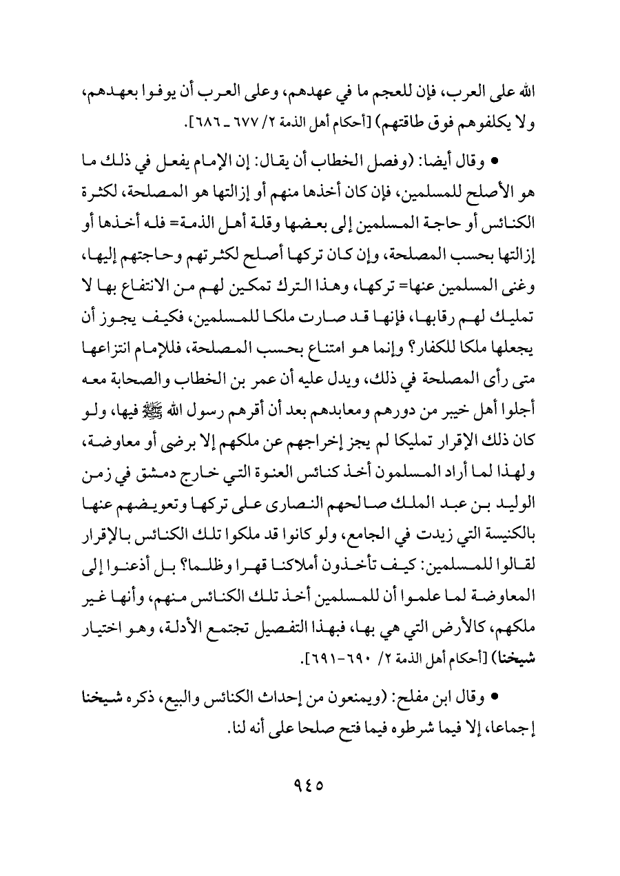 - وقال أيضا: (وفصل الخطاب أن يقال: إن الإمام يفعل في ذلك ما هو الأصلح للمسلمين، فإن كان أخذها منهم أو إزالتها هو المصلحة، لكثرة الكنائس أو حاجة المسلمين إلى بعضها وقلة أهل الذمة= فله أخذها أو إزالتها بحسب المصلحة، وإن كان تركها أصلح لكثرتهم وحاجتهم إليها، وغنى المسلمين عنها= تركها، وهذا الترك تمكين لهم من الانتفاع بها لا تمليك لهم رقابها، فإنها قد صارت ملكا للمسلمين، فكيف يجوز أن يجعلها ملكا للكفار؟ وإنما هو امتناع بحسب المصلحة، فللإمام انتزاعها متى رأى المصلحة في ذلك، ويدل عليه أن عمر بن الخطاب والصحابة معه أجلوا أهل خيبر من دورهم ومعابدهم بعد أن أقرهم رسول الله - صلى الله عليه وسلم - فيها، ولو كان ذلك الإقرار تمليكا لم يجز إخراجهم عن ملكهم إلا برضى أو معاوضة، ولهذا لما أراد المسلمون أخذ كنائس العنوة التي خارج دمشق في زمن الوليد بن عبد الملك صالحهم النصارى على تركها وتعويضهم عنها بالكنيسة التي زيدت في الجامع، ولو كانوا قد ملكوا تلك الكنائس بالإقرار لقالوا للمسلمين: كيف تأخذون أملاكنا قهرا وظلما؟ بل أذعنوا إلى المعاوضة لما علموا أن للمسلمين أخذ تلك الكنائس منهم، وأنها غير ملكهم، كالأرض التي هي بها، فبهذا التفصيل تجتمع الأدلة، وهو اختيار شيخنا) [أحكام أهل الذمة ٢/ ٦٩٠ - ٦٩١].