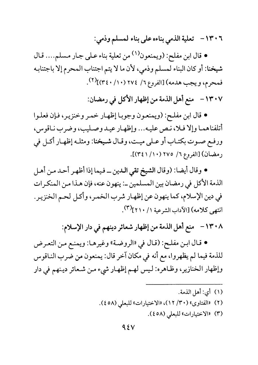 ١٣٠٨ - منع أهل الذمة من إظهار شعائر دينهم في دار الإسلام: