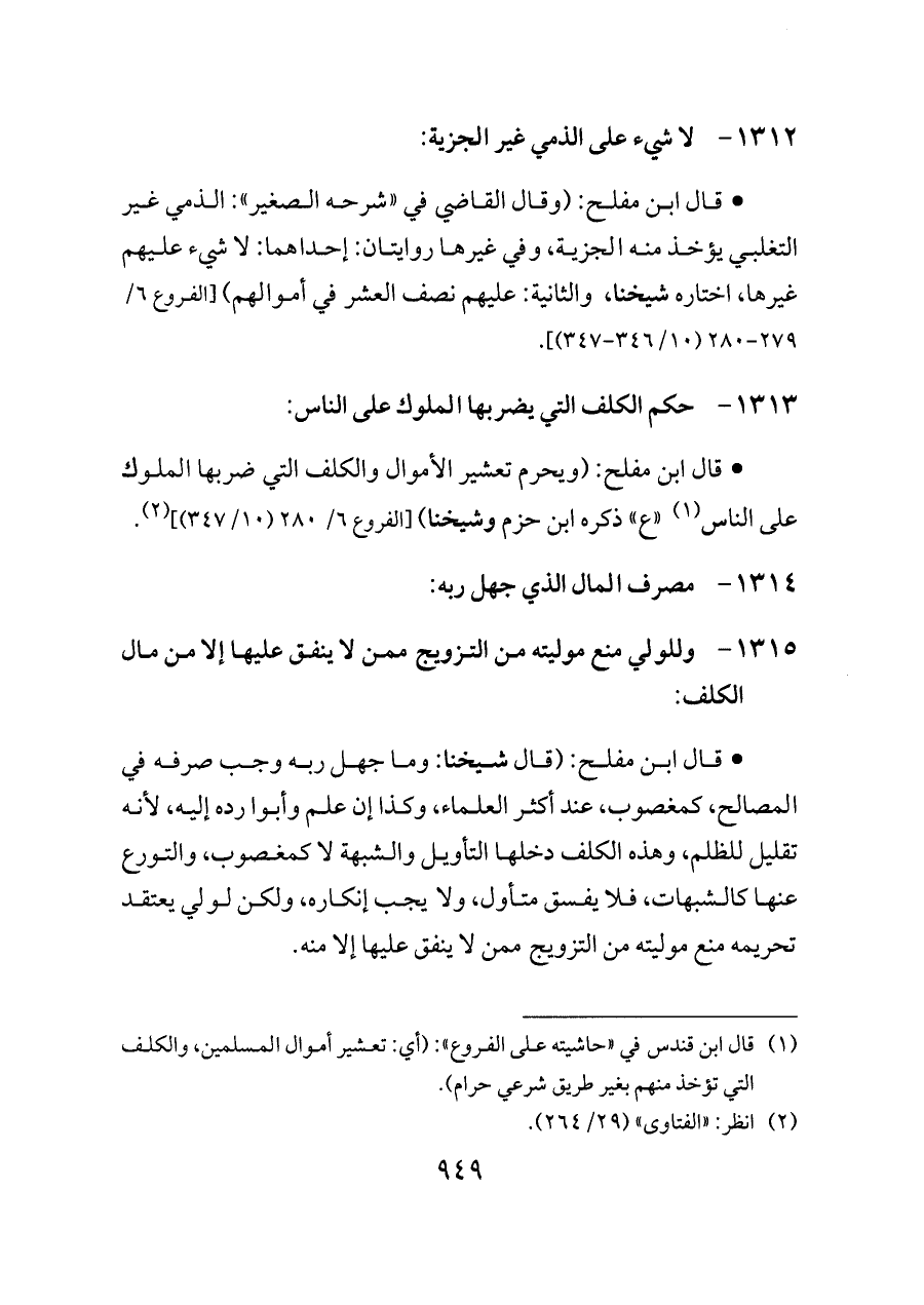 - قال ابن مفلح: (قال شيخنا: وما جهل ربه وجب صرفه في المصالح، كمغصوب، عند أكثر العلماء، وكذا إن علم وأبوا رده إليه، لأنه تقليل للظلم، وهذه الكلف دخلها التأويل والشبهة لا كمغصوب، والتورع عنها كالشبهات، فلا يفسق متأول، ولا يجب إنكاره، ولكن لولي يعتقد تحريمه منع موليته من التزويج ممن لا ينفق عليها إلا منه.