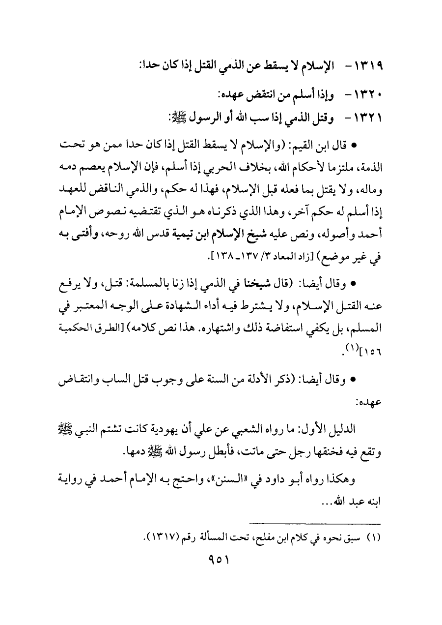 ١٣٢١ - وقتل الذمي إذا سب الله أو الرسول - صلى الله عليه وسلم -: