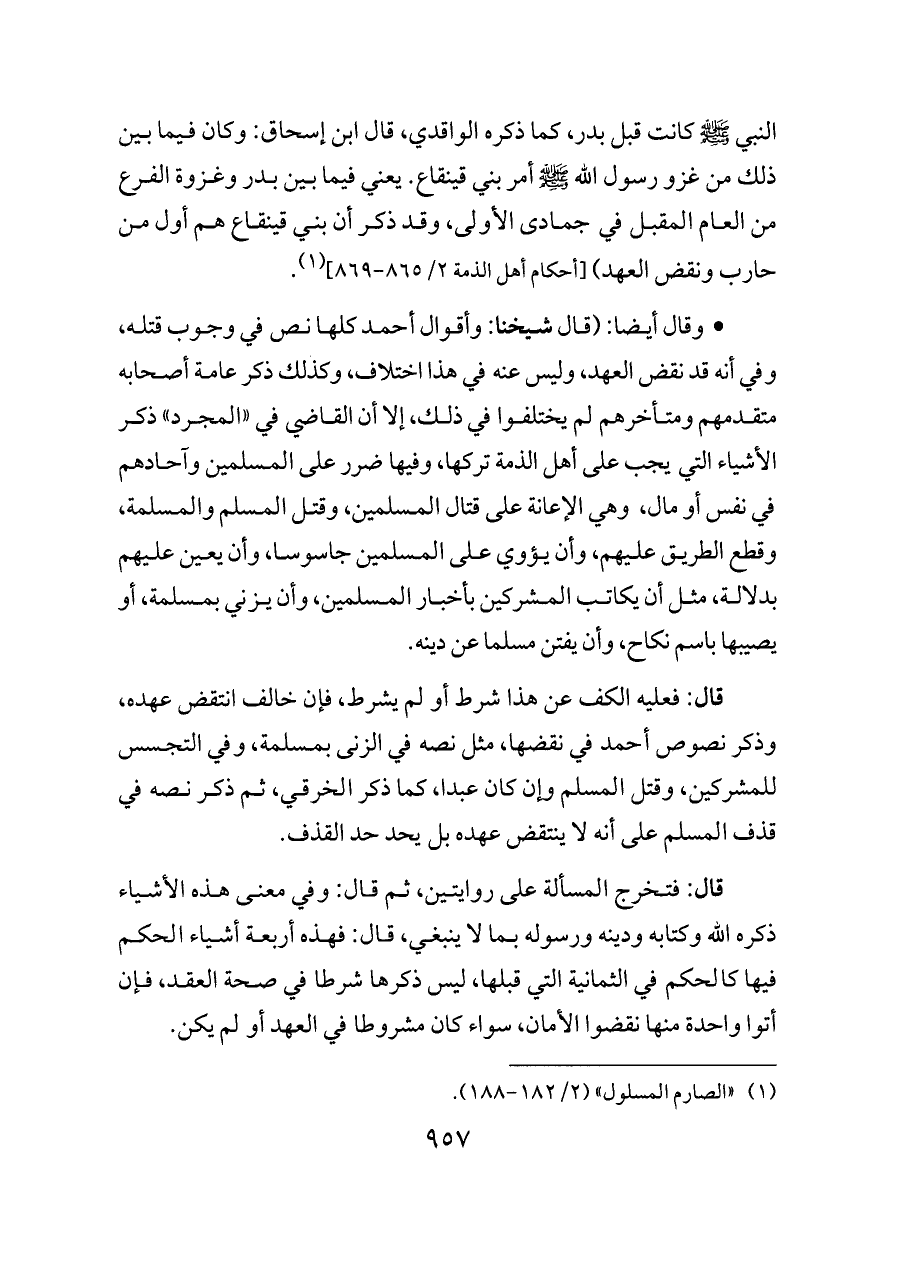 - وقال أيضا: (قال شيخنا: وأقوال أحمد كلها نص في وجوب قتله، وفي أنه قد نقض العهد، وليس عنه في هذا اختلاف، وكذلك ذكر عامة أصحابه متقدمهم ومتأخرهم لم يختلفوا في ذلك، إلا أن القاضي في «المجرد» ذكر الأشياء التي يجب على أهل الذمة تركها، وفيها ضرر على المسلمين وآحادهم في نفس أو مال، وهي الإعانة على قتال المسلمين، وقتل المسلم والمسلمة، وقطع الطريق عليهم، وأن يؤوي على المسلمين جاسوسا، وأن يعين عليهم بدلالة، مثل أن يكاتب المشركين بأخبار المسلمين، وأن يزني بمسلمة، أو يصيبها باسم نكاح، وأن يفتن مسلما عن دينه.