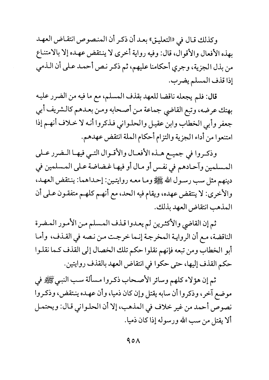وذكروا في جميع هذه الأفعال والأقوال التي فيها الضرر على المسلمين وآحادهم في نفس أو مال أو فيها غضاضة على المسلمين في دينهم مثل سب رسول الله - صلى الله عليه وسلم - وما معه روايتين: إحداهما: ينتقض العهد، والأخرى: لا ينتقض عهده، ويقام فيه الحد، مع أنهم كلهم متفقون على أن المذهب انتقاض العهد بذلك.