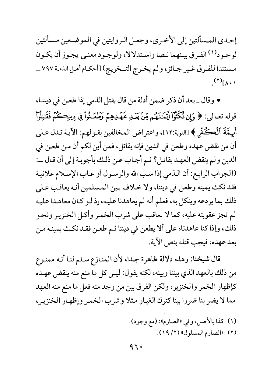 - وقال ــ بعد أن ذكر ضمن أدلة من قال بقتل الذمي إذا طعن في ديننا، قوله تعالى: {وَإِنْ نَكَثُوا أَيْمَانَهُمْ مِنْ بَعْدِ عَهْدِهِمْ وَطَعَنُوا فِي دِينِكُمْ فَقَاتِلُوا أَئِمَّةَ الْكُفْرِ} [التوبة: ١٢]، واعتراض المخالفين بقولهم: الآية تدل على أن من نقض عهده وطعن في الدين فإنه يقاتل، فمن أين لكم أن من طعن في الدين ولم ينقض العهد يقاتل؟ ثم أجاب عن ذلك بأجوبة إلى أن قال ــ: (الجواب الرابع: أن الذمي إذا سب الله والرسول أو عاب الإسلام علانية فقد نكث يمينه وطعن في ديننا، ولا خلاف بين المسلمين أنه يعاقب على ذلك بما يردعه وينكل به، فعلم أنه لم يعاهدنا عليه، إذ لو كان معاهدا عليه لم تجز عقوبته عليه، كما لا يعاقب على شرب الخمر وأكل الخنزير ونحو ذلك، وإذا كنا عاهدناه على ألا يطعن في ديننا ثم طعن فقد نكث يمينه من بعد عهده، فيجب قتله بنص الآية.
