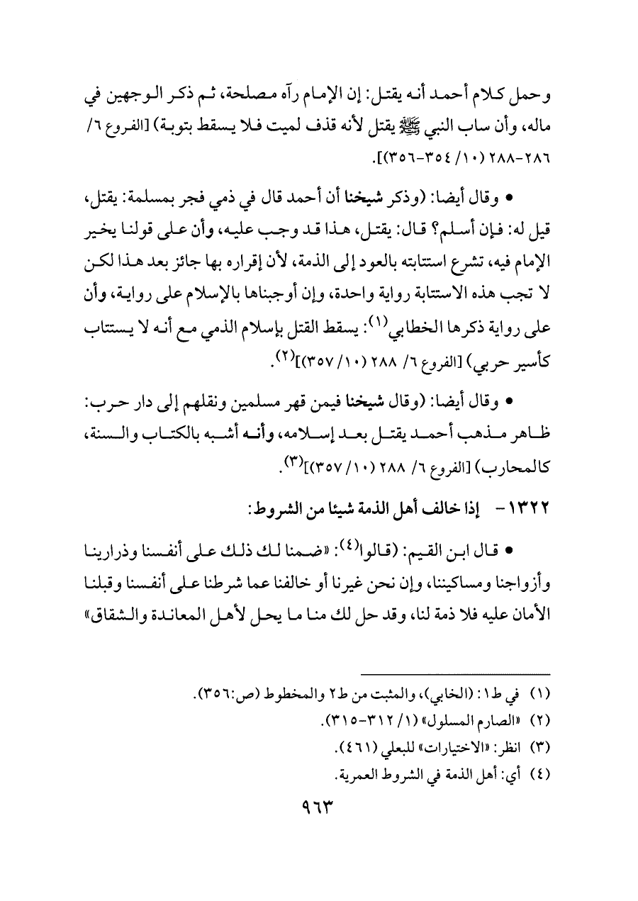 - وقال أيضا: (وذكر شيخنا أن أحمد قال في ذمي فجر بمسلمة: يقتل، قيل له: فإن أسلم؟ قال: يقتل، هذا قد وجب عليه، وأن على قولنا يخير الإمام فيه، تشرع استتابته بالعود إلى الذمة، لأن إقراره بها جائز بعد هذا لكن لا تجب هذه الاستتابة رواية واحدة، وإن أوجبناها بالإسلام على رواية، وأن على رواية ذكرها الخطابي (¬١): يسقط القتل بإسلام الذمي مع أنه لا يستتاب كأسير حربي) [الفروع ٦/ ٢٨٨ (١٠/ ٣٥٧)] (¬٢).