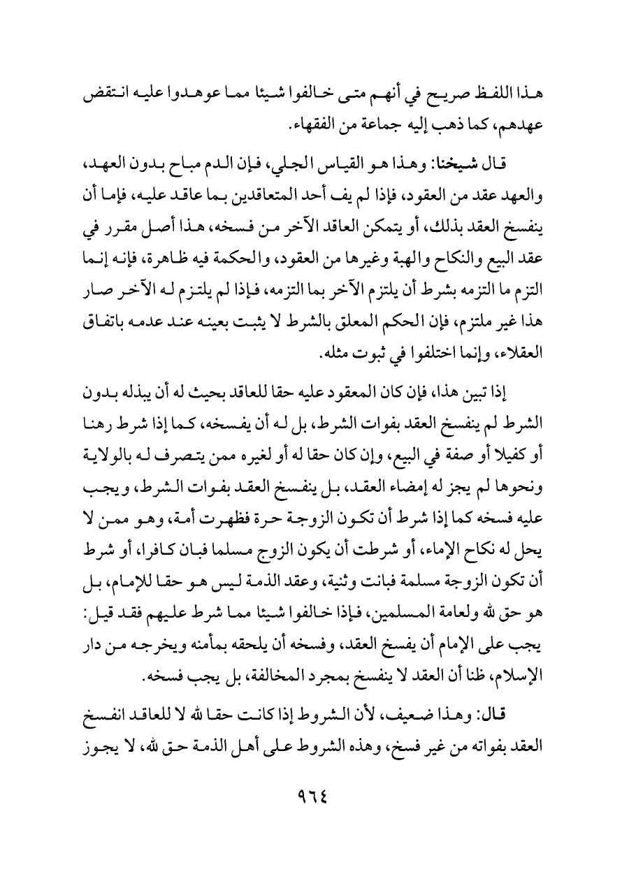 إذا تبين هذا، فإن كان المعقود عليه حقا للعاقد بحيث له أن يبذله بدون الشرط لم ينفسخ العقد بفوات الشرط، بل له أن يفسخه، كما إذا شرط رهنا أو كفيلا أو صفة في البيع، وإن كان حقا له أو لغيره ممن يتصرف له بالولاية ونحوها لم يجز له إمضاء العقد، بل ينفسخ العقد بفوات الشرط، ويجب عليه فسخه كما إذا شرط أن تكون الزوجة حرة فظهرت أمة، وهو ممن لا يحل له نكاح الإماء، أو شرطت أن يكون الزوج مسلما فبان كافرا، أو شرط أن تكون الزوجة مسلمة فبانت وثنية، وعقد الذمة ليس هو حقا للإمام، بل هو حق لله ولعامة المسلمين، فإذا خالفوا شيئا مما شرط عليهم فقد قيل: يجب على الإمام أن يفسخ العقد، وفسخه أن يلحقه بمأمنه ويخرجه من دار الإسلام، ظنا أن العقد لا ينفسخ بمجرد المخالفة، بل يجب فسخه.