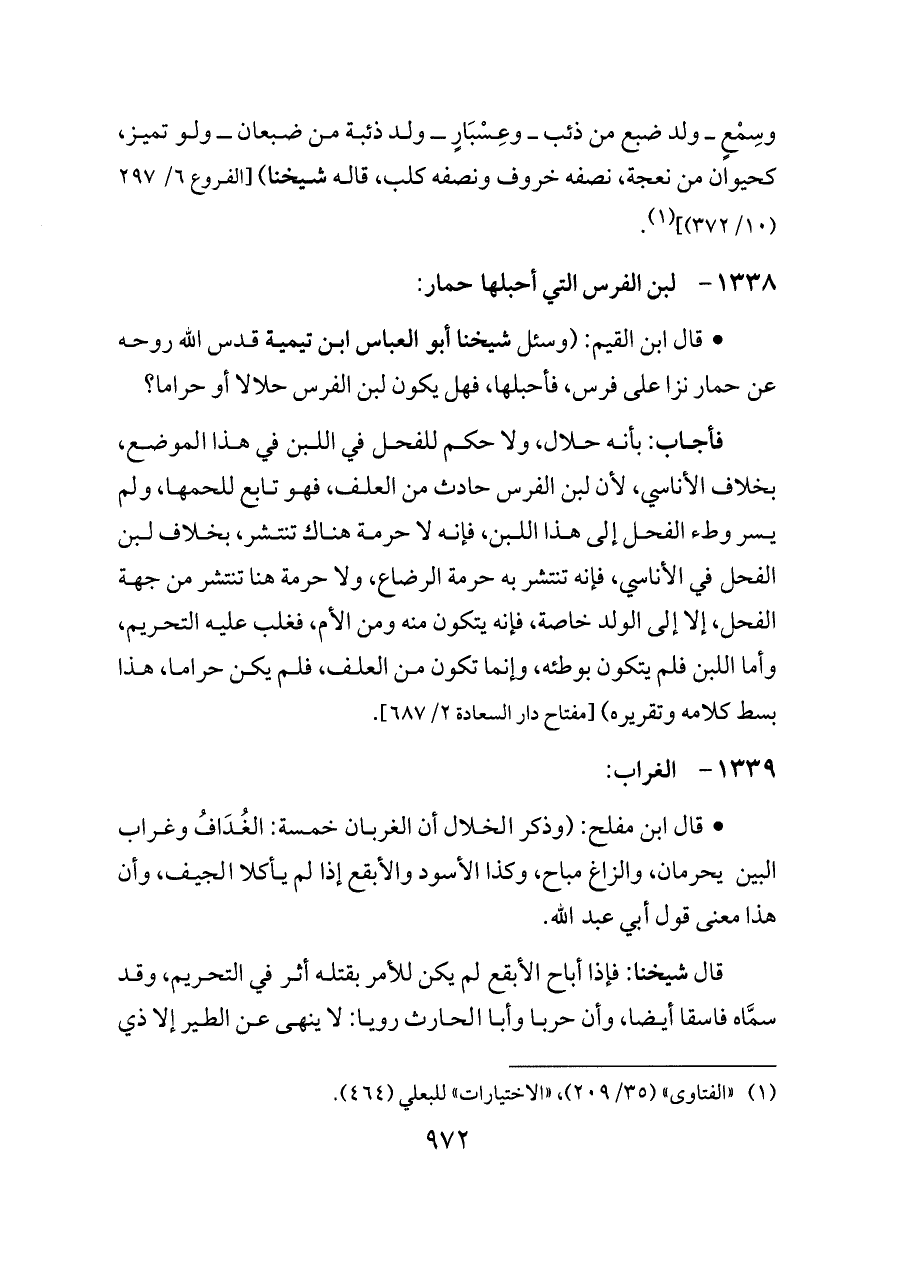 - قال ابن القيم: (وسئل شيخنا أبو العباس ابن تيمية قدس الله روحه عن حمار نزا على فرس، فأحبلها، فهل يكون لبن الفرس حلالا أو حراما؟