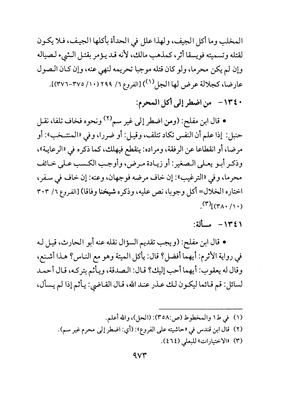 - قال ابن مفلح: (ومن اضطر إلى غير سم (¬٢) ونحوه فخاف تلفا، نقل حنبل: إذا علم أن النفس تكاد تتلف، وقيل: أو ضررا، وفي «المنتخب»: أو مرضا، أو انقطاعا عن الرفقة، ومراده: ينقطع فيهلك، كما ذكره في «الرعاية»، وذكر أبو يعلى الصغير: أو زيادة مرض، وأوجب الكسب على خائف محرما، وفي «الترغيب»: إن خاف مرضه فوجهان، وعنه: إن خاف في سفر، اختاره الخلال= أكل وجوبا، نص عليه، وذكره شيخنا وفاقا) [الفروع ٦/ ٣٠٣ (١٠/ ٣٨٠)] (¬٣).