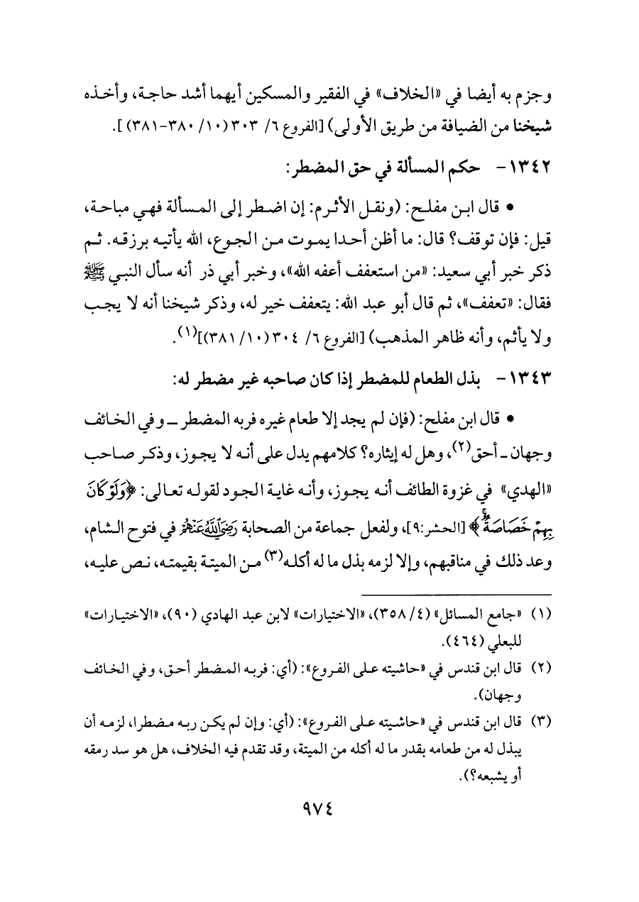 (¬٣) قال ابن قندس في «حاشيته على الفروع»: (أي: وإن لم يكن ربه مضطرا، لزمه أن يبذل له من طعامه بقدر ما له أكله من الميتة، وقد تقدم فيه الخلاف، هل هو سد رمقه أو يشبعه؟).