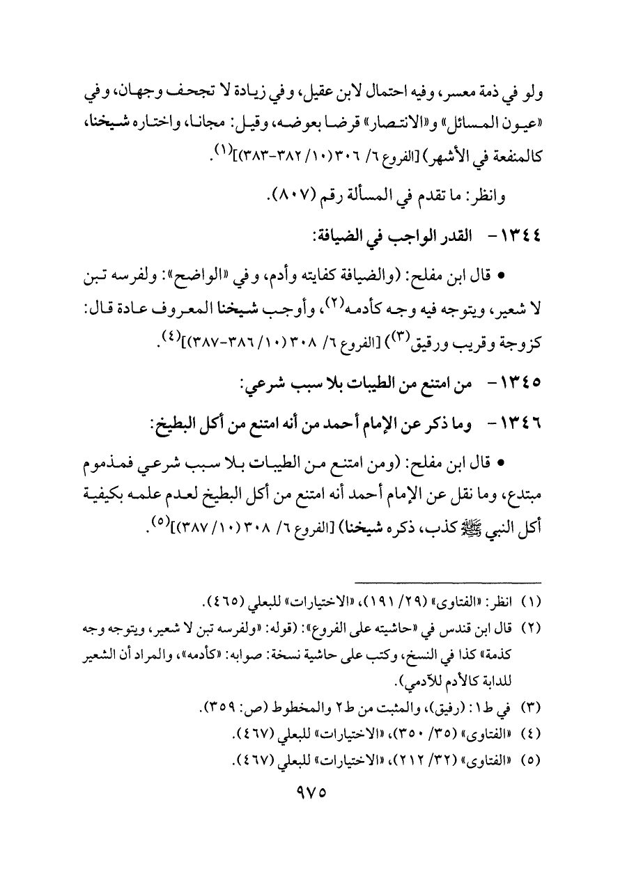 - قال ابن مفلح: (والضيافة كفايته وأدم، وفي «الواضح»: ولفرسه تبن لا شعير، ويتوجه فيه وجه كأدمه (¬٢)، وأوجب شيخنا المعروف عادة قال: كزوجة وقريب ورقيق (¬٣)) [الفروع ٦/ ٣٠٨ (١٠/ ٣٨٦ - ٣٨٧)] (¬٤).