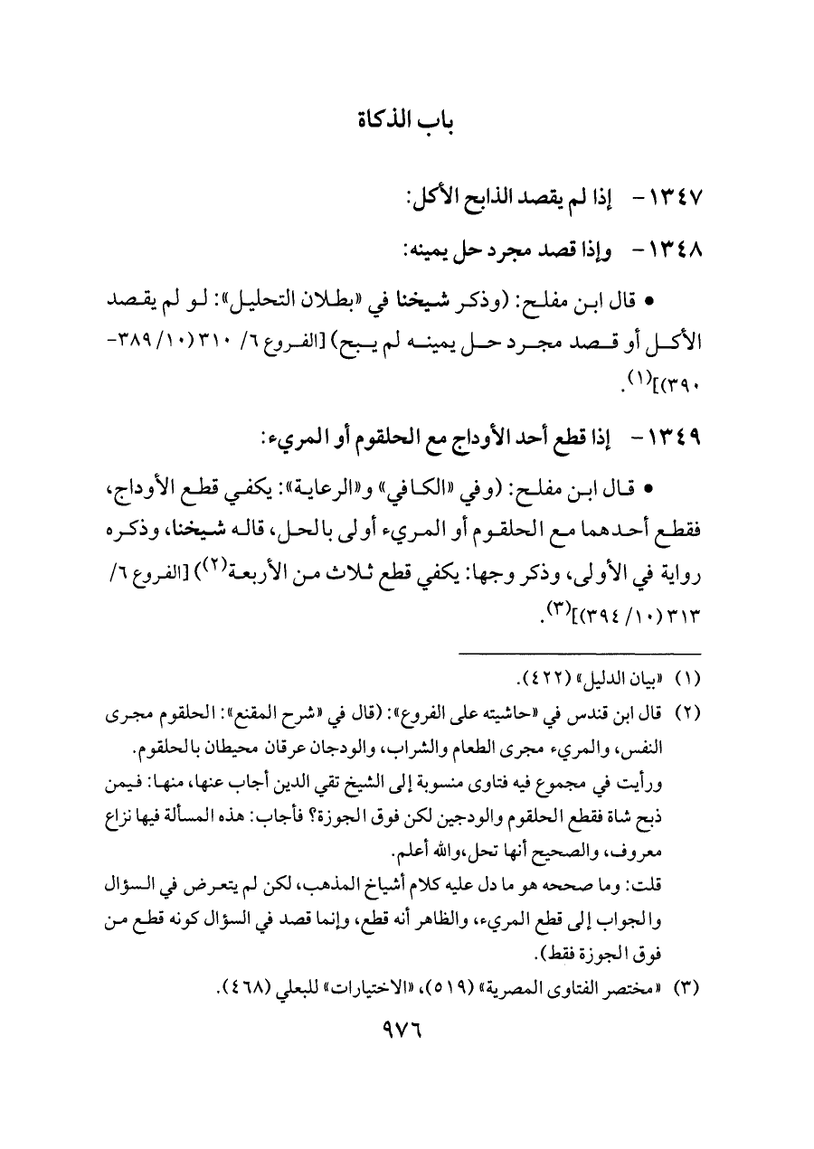 - قال ابن مفلح: (وفي «الكافي» و «الرعاية»: يكفي قطع الأوداج، فقطع أحدهما مع الحلقوم أو المريء أولى بالحل، قاله شيخنا، وذكره رواية في الأولى، وذكر وجها: يكفي قطع ثلاث من الأربعة (¬٢))