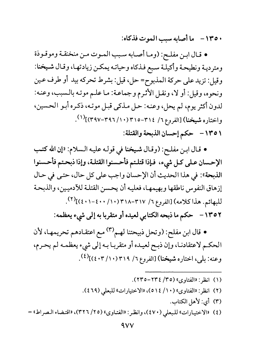 - قال ابن مفلح: (وقال شيخنا في قوله عليه السلام: «إن الله كتب الإحسان على كل شيء، فإذا قتلتم فأحسنوا القتلة، وإذا ذبحتم فأحسنوا الذبحة»: في هذا الحديث أن الإحسان واجب على كل حال، حتى في حال إزهاق النفوس ناطقها وبهيمها، فعليه أن يحسن القتلة للآدميين، والذبحة للبهائم. هذا كلامه) [الفروع ٦/ ٣١٧ - ٣١٨ (١٠/ ٤٠٠ - ٤٠١)] (¬٢).