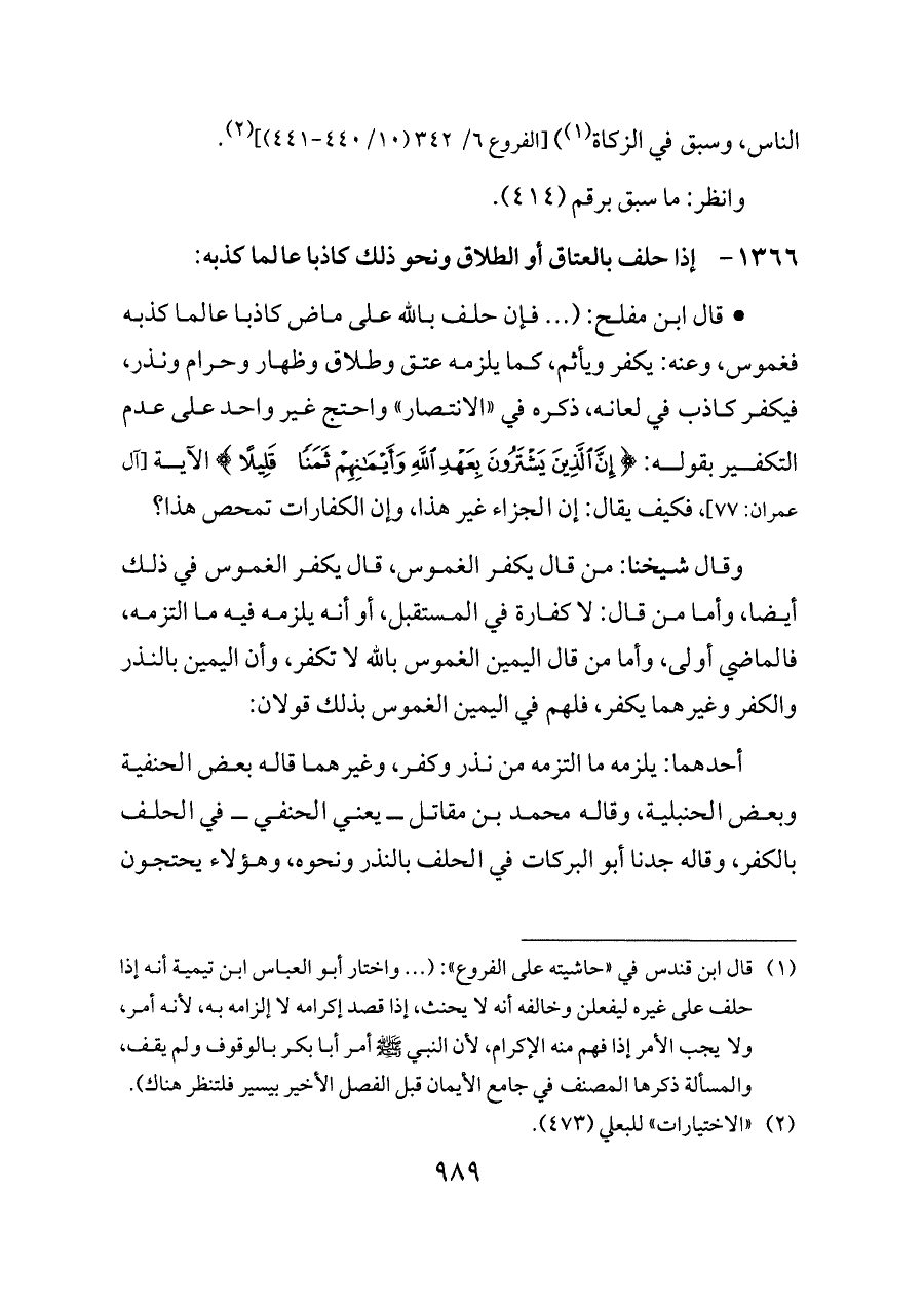 - قال ابن مفلح: ( ... فإن حلف بالله على ماض كاذبا عالما كذبه فغموس، وعنه: يكفر ويأثم، كما يلزمه عتق وطلاق وظهار وحرام ونذر، فيكفر كاذب في لعانه، ذكره في «الانتصار» واحتج غير واحد على عدم التكفير بقوله: {إِنَّ الَّذِينَ يَشْتَرُونَ بِعَهْدِ اللَّهِ وَأَيْمَانِهِمْ ثَمَنًا قَلِيلًا} الآية [آل عمران: ٧٧]، فكيف يقال: إن الجزاء غير هذا، وإن الكفارات تمحص هذا؟