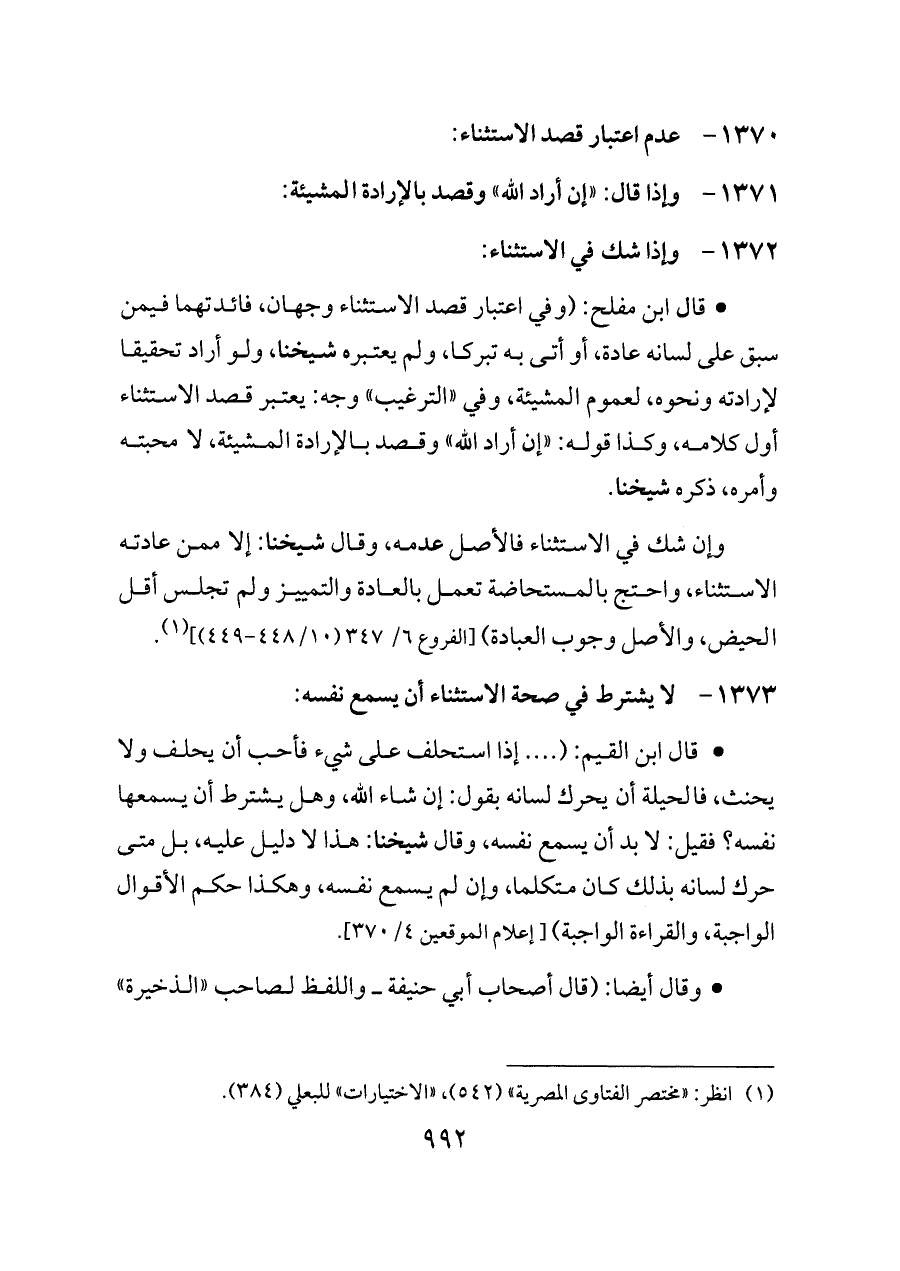 - قال ابن مفلح: (وفي اعتبار قصد الاستثناء وجهان، فائدتهما فيمن سبق على لسانه عادة، أو أتى به تبركا، ولم يعتبره شيخنا، ولو أراد تحقيقا لإرادته ونحوه، لعموم المشيئة، وفي «الترغيب» وجه: يعتبر قصد الاستثناء أول كلامه، وكذا قوله: «إن أراد الله» وقصد بالإرادة المشيئة، لا محبته وأمره، ذكره شيخنا.