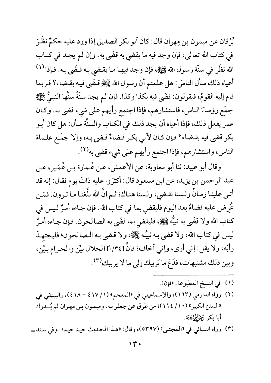 بُرْقان عن ميمون بن مِهران قال: كان أبو بكر الصديق إذا ورد عليه حكمٌ نظَرَ في كتاب الله تعالى، فإن وجد فيه ما يقضي به قضَى به. وإن لم يجد في كتاب الله نظَر في سنّة رسول الله - صلى الله عليه وسلم -، فإن وجد فيها ما يقضي به قضَى به. فإذا (¬١) أعياه ذلك سأل الناسَ: هل علمتم أن رسول الله - صلى الله عليه وسلم - قضَى فيه بقضاء؟ فربما قام إليه القومُ، فيقولون: قضَى فيه بكذا وكذا. فإن لم يجد سنّةً سنَّها النبيُّ - صلى الله عليه وسلم - جمَع رؤساءَ الناس، فاستشارهم، فإذا اجتمع رأيهم على شيء قضى به. وكان عمر يفعل ذلك، فإذا أعياه أن يجد ذلك في الكتاب والسنَّة سأل: هل كان أبو بكر قضى فيه بقضاء؟ فإن كان لأبي بكر قضاءٌ قضى به، وإلا جمَع علماءَ الناس، واستشارهم، فإذا اجتمع رأيهم على شيء قضى به (¬٢).