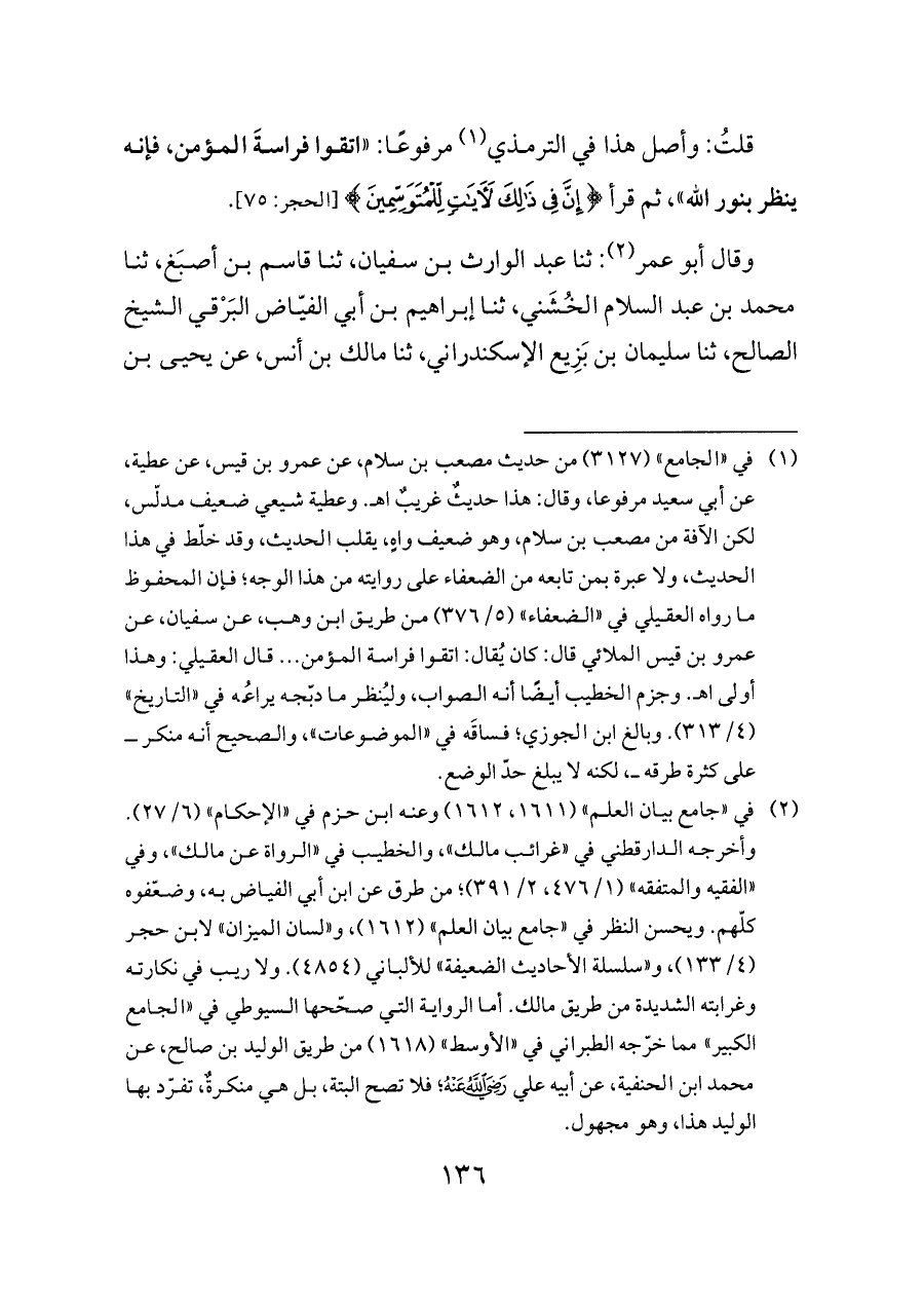 (¬١) في "الجامع" (٣١٢٧) من حديث مصعب بن سلام، عن عمرو بن قيس، عن عطية، عن أبي سعيد مرفوعا، وقال: هذا حديثٌ غريبٌ اهـ. وعطية شيعي ضعيف مدلّس، لكن الآفة من مصعب بن سلام، وهو ضعيف واهٍ، يقلب الحديث، وقد خلّط في هذا الحديث، ولا عبرة بمن تابعه من الضعفاء على روايته من هذا الوجه؛ فإن المحفوظ ما رواه العقيلي في "الضعفاء" (٥/ ٣٧٦) من طريق ابن وهب، عن سفيان، عن عمرو بن قيس الملائي قال: كان يُقال: اتقوا فراسة المؤمن ... قال العقيلي: وهذا أولى اهـ. وجزم الخطيب أيضًا أنه الصواب، وليُنظر ما دبّجه يراعُه في "التاريخ" (٤/ ٣١٣). وبالغ ابن الجوزي؛ فساقَه في "الموضوعات"، والصحيح أنه منكر ــ على كثرة طرقه ــ، لكنه لا يبلغ حدّ الوضع.