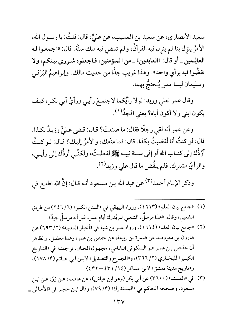 وقال عمر لعلي وزيد: لولا رأيُكما لاجتمعَ رأيي ورأيُ أبي بكر، كيف يكون ابني ولا أكون أباه؟ يعني الجدَّ (¬١).