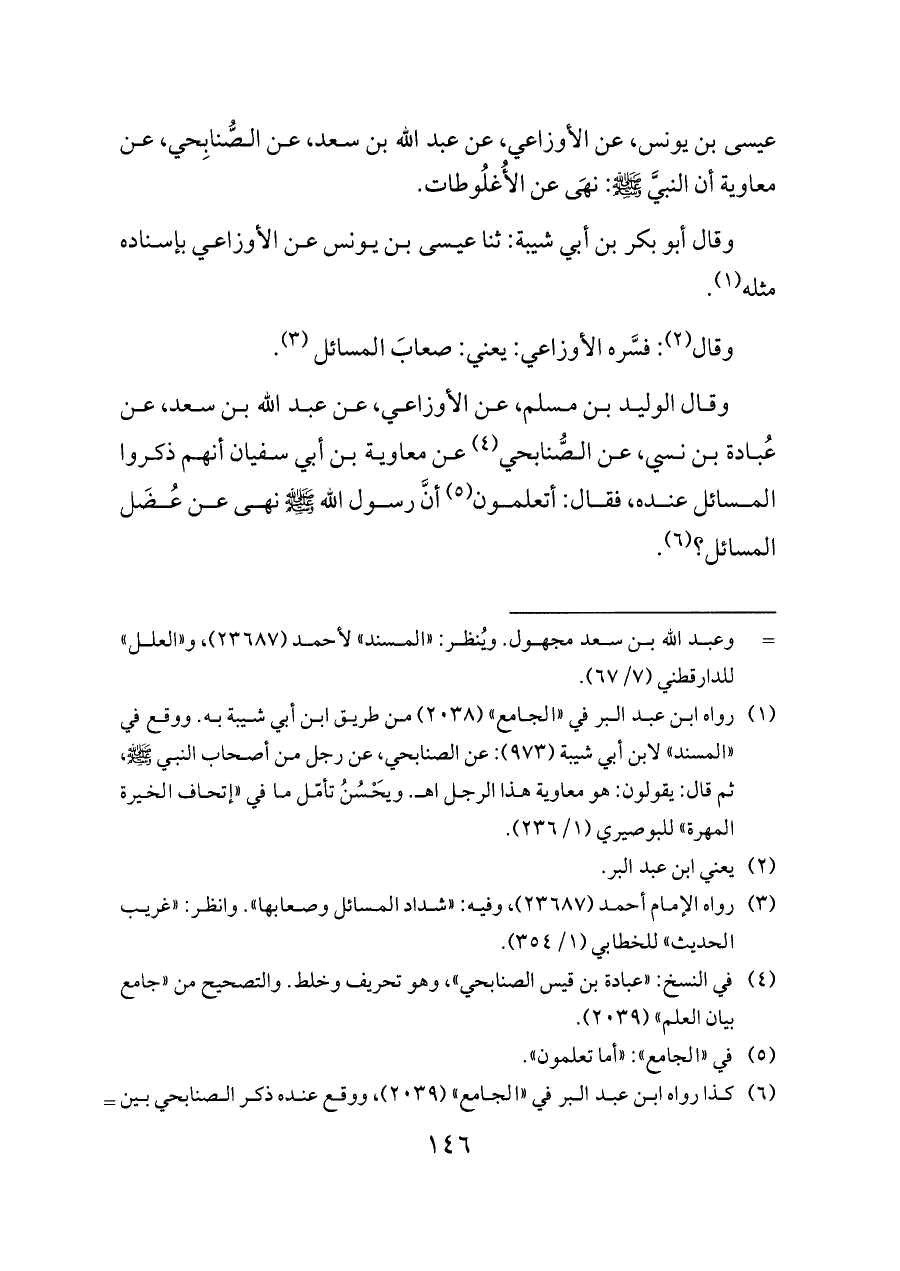 عيسى بن يونس، عن الأوزاعي، عن عبد الله بن سعد، عن الصُّنابِحي، عن معاوية أن النبيَّ - صلى الله عليه وسلم -: نهَى عن الأُغلُوطات.