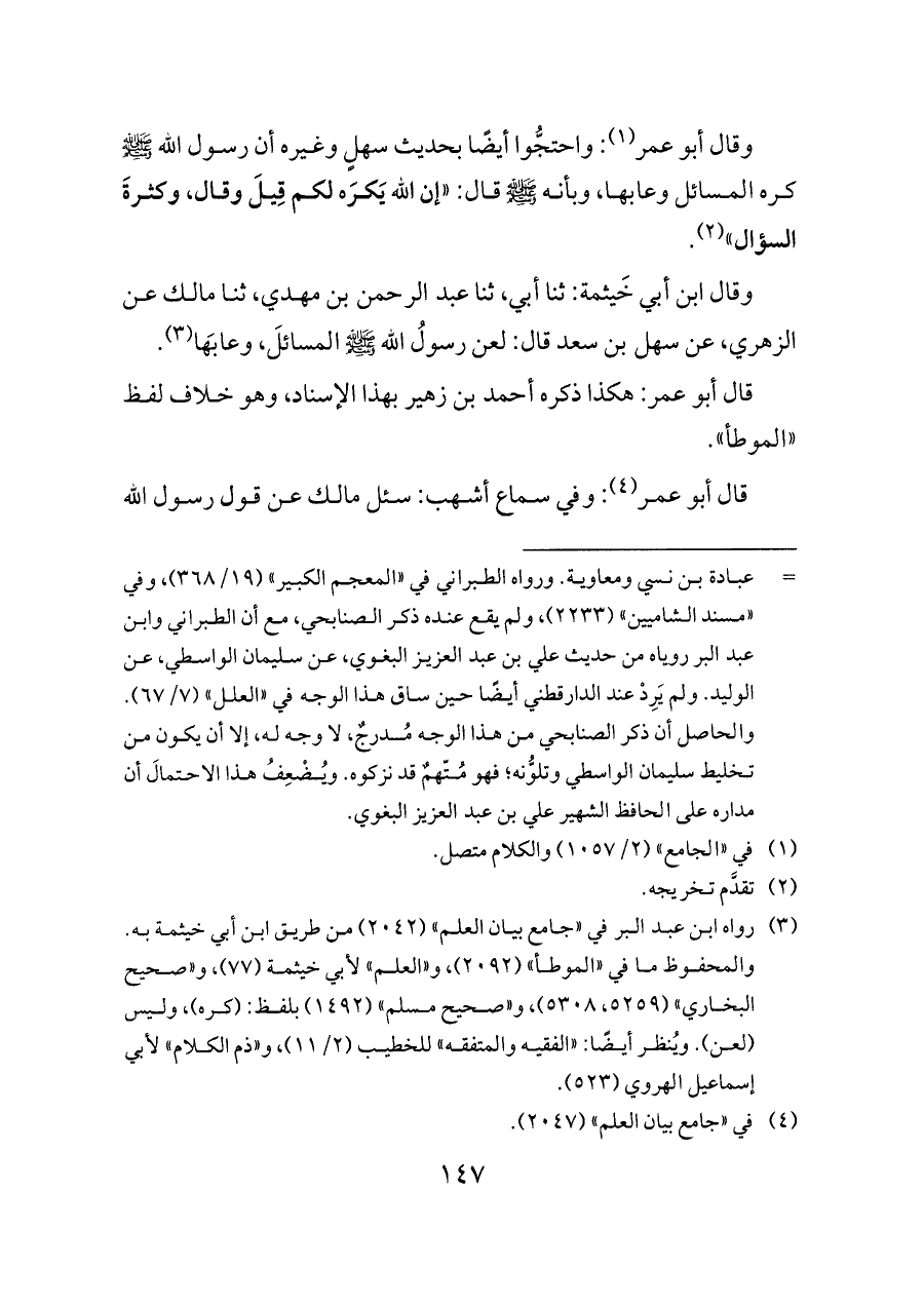 (¬٣) رواه ابن عبد البر في "جامع بيان العلم" (٢٠٤٢) من طريق ابن أبي خيثمة به. والمحفوظ ما في "الموطأ" (٢٠٩٢)، و"العلم" لأبي خيثمة (٧٧)، و"صحيح البخاري" (٥٢٥٩، ٥٣٠٨)، و"صحيح مسلم" (١٤٩٢) بلفظ: (كره)، وليس (لعن). ويُنظر أيضًا: "الفقيه والمتفقه" للخطيب (٢/ ١١)، و"ذم الكلام" لأبي إسماعيل الهروي (٥٢٣).