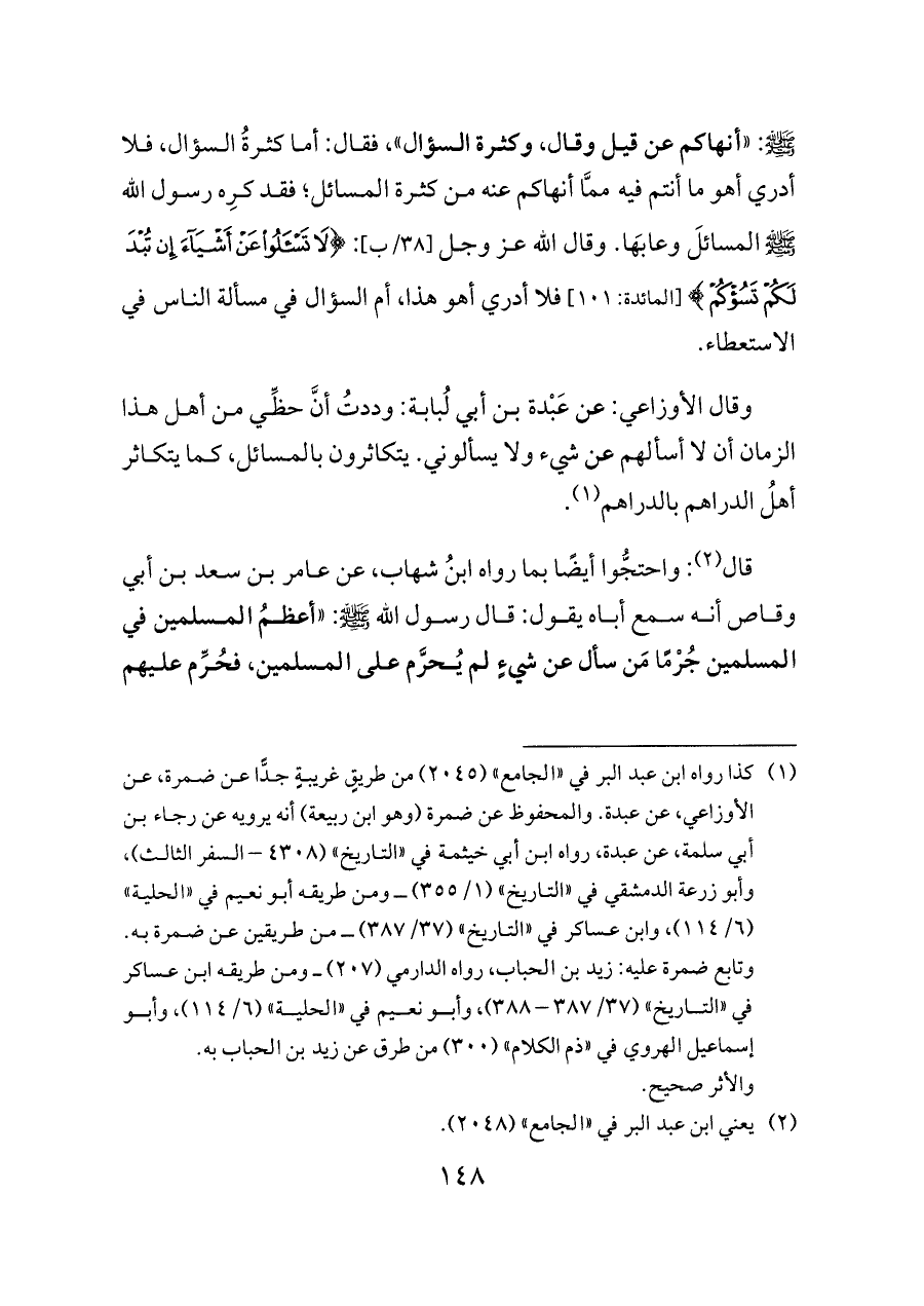 - صلى الله عليه وسلم -: "أنهاكم عن قيل وقال، وكثرة السؤال"، فقال: أما كثرةُ السؤال، فلا أدري أهو ما أنتم فيه ممَّا أنهاكم عنه من كثرة المسائل؛ فقد كرِه رسول الله - صلى الله عليه وسلم - المسائلَ وعابَها. وقال الله عز وجل [٣٨/ب]: {لَا تَسْأَلُوا عَنْ أَشْيَاءَ إِنْ تُبْدَ لَكُمْ تَسُؤْكُمْ} [المائدة: ١٠١] فلا أدري أهو هذا، أم السؤال في مسألة الناس في الاستعطاء.