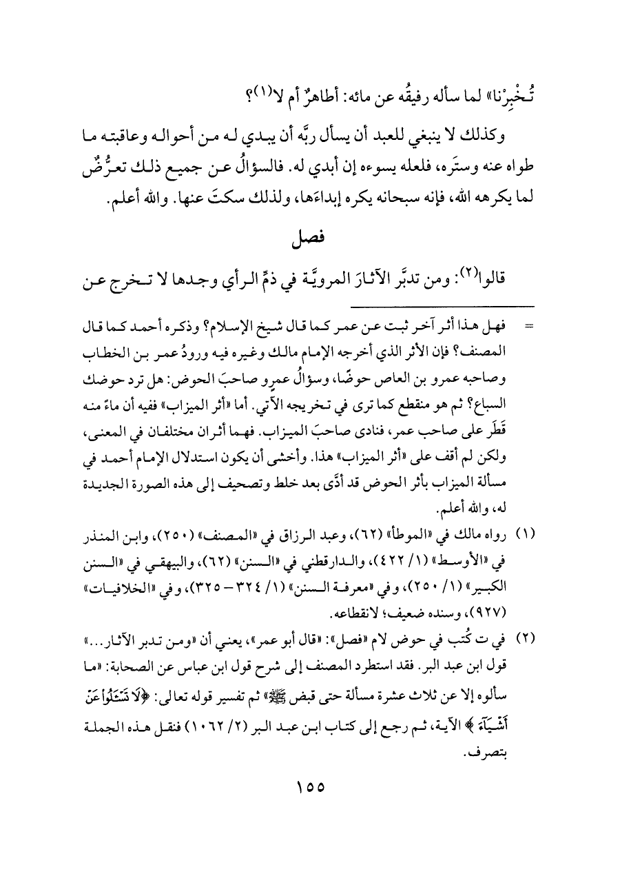 (¬٢) في ت كُتب في حوض لام "فصل": "قال أبو عمر"، يعني أن "ومن تدبر الآثار ... " قول ابن عبد البر. فقد استطرد المصنف إلى شرح قول ابن عباس عن الصحابة: "ما سألوه إلا عن ثلاث عشرة مسألة حتى قبض - صلى الله عليه وسلم -" ثم تفسير قوله تعالى: {لَا تَسْأَلُوا عَنْ أَشْيَاءَ} الآية، ثم رجع إلى كتاب ابن عبد البر (٢/ ١٠٦٢) فنقل هذه الجملة بتصرف.