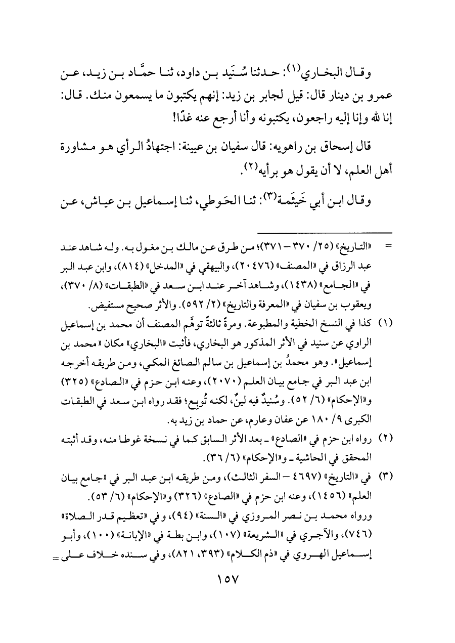 (¬٣) في "التاريخ" (٤٦٩٧ - السفر الثالث)، ومن طريقه ابن عبد البر في "جامع بيان العلم" (١٤٥٦)، وعنه ابن حزم في "الصادع" (٣٢٦) و"الإحكام" (٦/ ٥٣).
