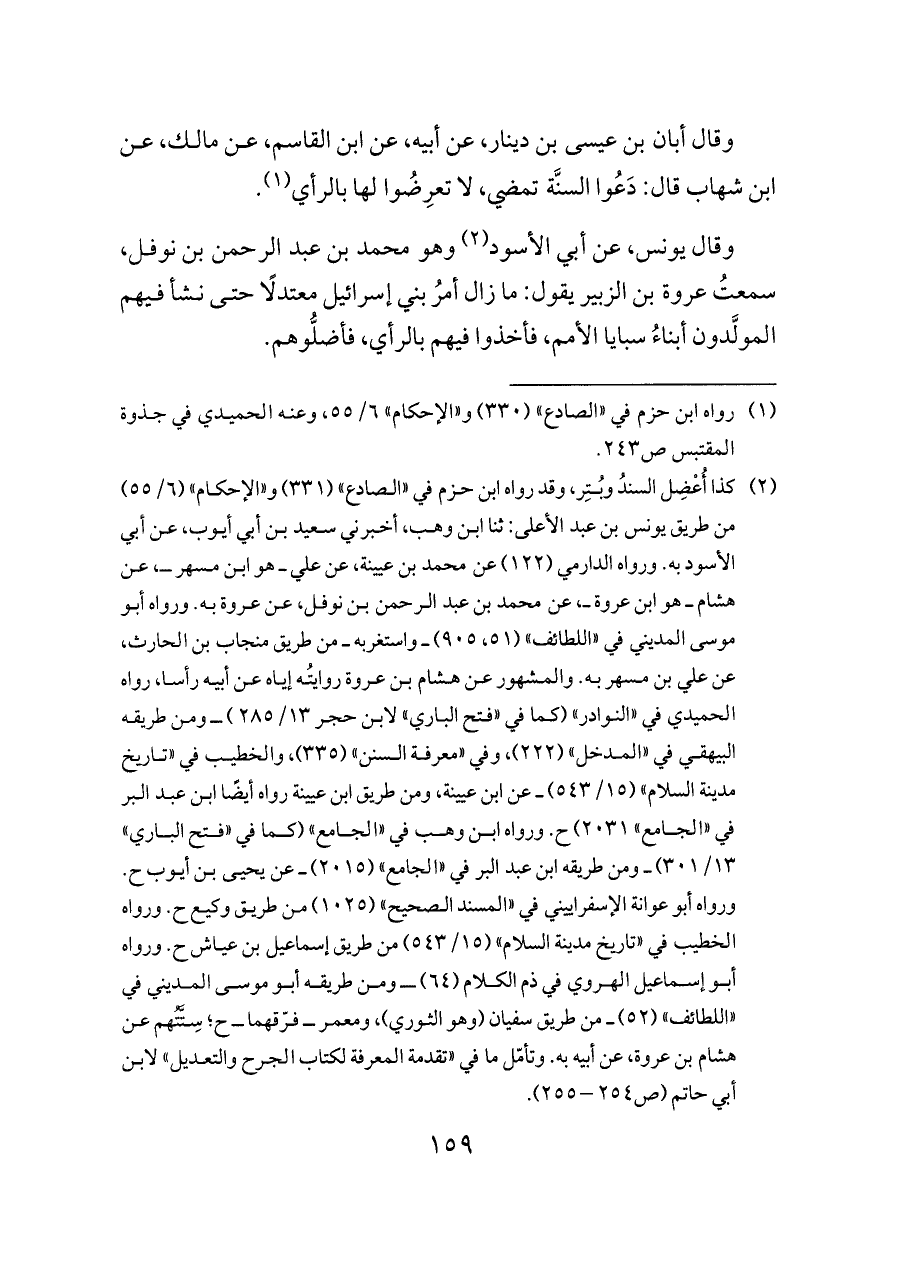(¬٢) كذا أُعْضِل السندُ وبُتِر، وقد رواه ابن حزم في "الصادع" (٣٣١) و"الإحكام" (٦/ ٥٥) من طريق يونس بن عبد الأعلى: ثنا ابن وهب، أخبرني سعيد بن أبي أيوب، عن أبي الأسود به. ورواه الدارمي (١٢٢) عن محمد بن عيينة، عن علي ــ هو ابن مسهر ــ، عن هشام ــ هو ابن عروة ــ، عن محمد بن عبد الرحمن بن نوفل، عن عروة به. ورواه أبو موسى المديني في "اللطائف" (٥١، ٩٠٥) ــ واستغربه ــ من طريق منجاب بن الحارث، عن علي بن مسهر به. والمشهور عن هشام بن عروة روايتُه إياه عن أبيه رأسا، رواه الحميدي في "النوادر" (كما في "فتح الباري" لابن حجر ١٣/ ٢٨٥) ــ ومن طريقه البيهقي في "المدخل" (٢٢٢)، وفي "معرفة السنن" (٣٣٥)، والخطيب في "تاريخ مدينة السلام" (١٥/ ٥٤٣) ــ عن ابن عيينة، ومن طريق ابن عيينة رواه أيضًا ابن عبد البر في "الجامع" ٢٠٣١) ح. ورواه ابن وهب في "الجامع" (كما في "فتح الباري" ١٣/ ٣٠١) ــ ومن طريقه ابن عبد البر في "الجامع" (٢٠١٥) ــ عن يحيى بن أيوب ح. ورواه أبو عوانة الإسفراييني في "المسند الصحيح" (١٠٢٥) من طريق وكيع ح. ورواه الخطيب في "تاريخ مدينة السلام" (١٥/ ٥٤٣) من طريق إسماعيل بن عياش ح. ورواه أبو إسماعيل الهروي في ذم الكلام (٦٤) ــ ومن طريقه أبو موسى المديني في "اللطائف" (٥٢) ــ من طريق سفيان (وهو الثوري)، ومعمر ــ فرّقهما ــ ح؛ سِتَّتُهم عن هشام بن عروة، عن أبيه به. وتأمّل ما في "تقدمة المعرفة لكتاب الجرح والتعديل" لابن أبي حاتم (ص ٢٥٤ - ٢٥٥).