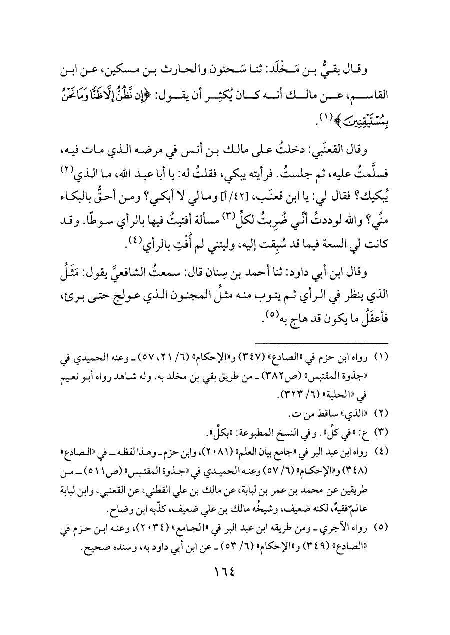 (¬٤) رواه ابن عبد البر في "جامع بيان العلم" (٢٠٨١)، وابن حزم ــ وهذا لفظه ــ في "الصادع" (٣٤٨) و"الإحكام" (٦/ ٥٧) وعنه الحميدي في "جذوة المقتبس" (ص ٥١١) ــ من طريقين عن محمد بن عمر بن لبابة، عن مالك بن علي القطني، عن القعنبي، وابن لبابة عالمٌ فقيهٌ، لكنه ضعيف، وشيخُه مالك بن علي ضعيف، كذّبه ابن وضاح.