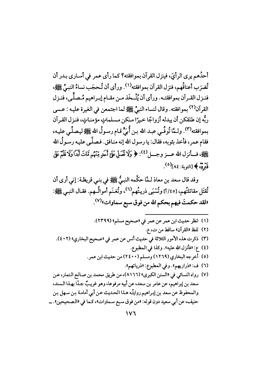 أحدُهم يرى الرأيَ، فينزل القرآن بموافقته؟ كما رأى عمر في أسارى بدر أن تُضرَب أعناقُهم، فنزل القرآن بموافقته (¬١). ورأى أن تُحجَب نساءُ النبيِّ - صلى الله عليه وسلم -، فنزل القرآن بموافقته. ورأى أن يُتَّخَذ من مقام إبراهيم مُصلًّى، فنزل القرآن (¬٢) بموافقته. وقال لنساء النبيِّ - صلى الله عليه وسلم - لما اجتمعن في الغيرة عليه: عسى ربُّه إن طلقكن أن يبدله أزواجًا خيرًا منكن مسلماتٍ مؤمناتٍ، فنزل القرآن بموافقته (¬٣). ولمَّا تُوفِّي عبد الله بن أُبَيٍّ قام رسولُ الله - صلى الله عليه وسلم - ليصلِّي عليه، فقام عمر، فأخذ بثوبه، فقال: يا رسول الله إنه منافق. فصلَّى عليه رسولُ الله - صلى الله عليه وسلم -، فأنزل الله عز وجل (¬٤): {وَلَا تُصَلِّ عَلَى أَحَدٍ مِنْهُمْ مَاتَ أَبَدًا وَلَا تَقُمْ عَلَى قَبْرِهِ} [التوبة: ٨٤] (¬٥).