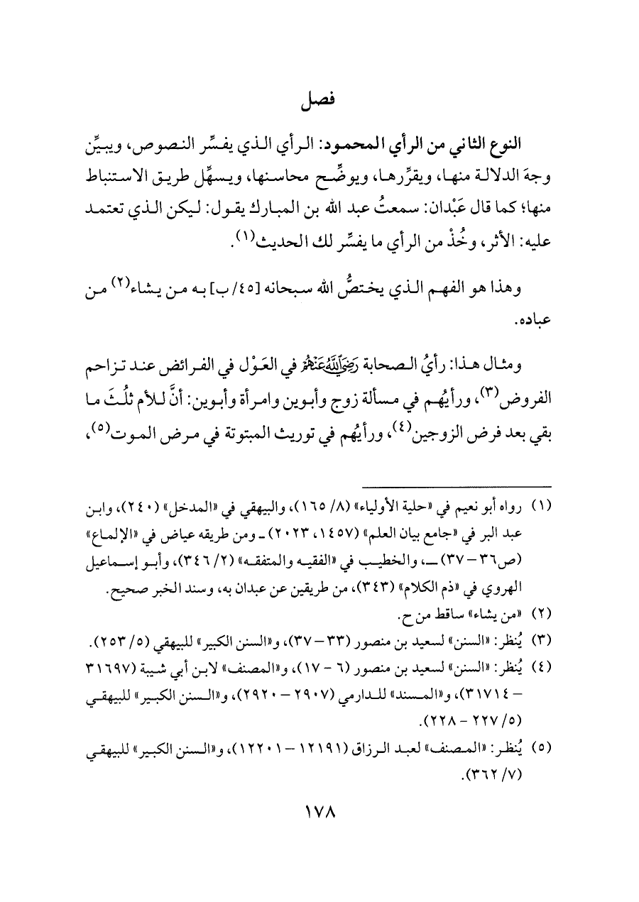 النوع الثاني من الرأي المحمود: الرأي الذي يفسِّر النصوص، ويبيِّن وجهَ الدلالة منها، ويقرِّرها، ويوضِّح محاسنها، ويسهِّل طريق الاستنباط منها؛ كما قال عَبْدان: سمعتُ عبد الله بن المبارك يقول: ليكن الذي تعتمد عليه: الأثر، وخُذْ من الرأي ما يفسِّر لك الحديث (¬١).