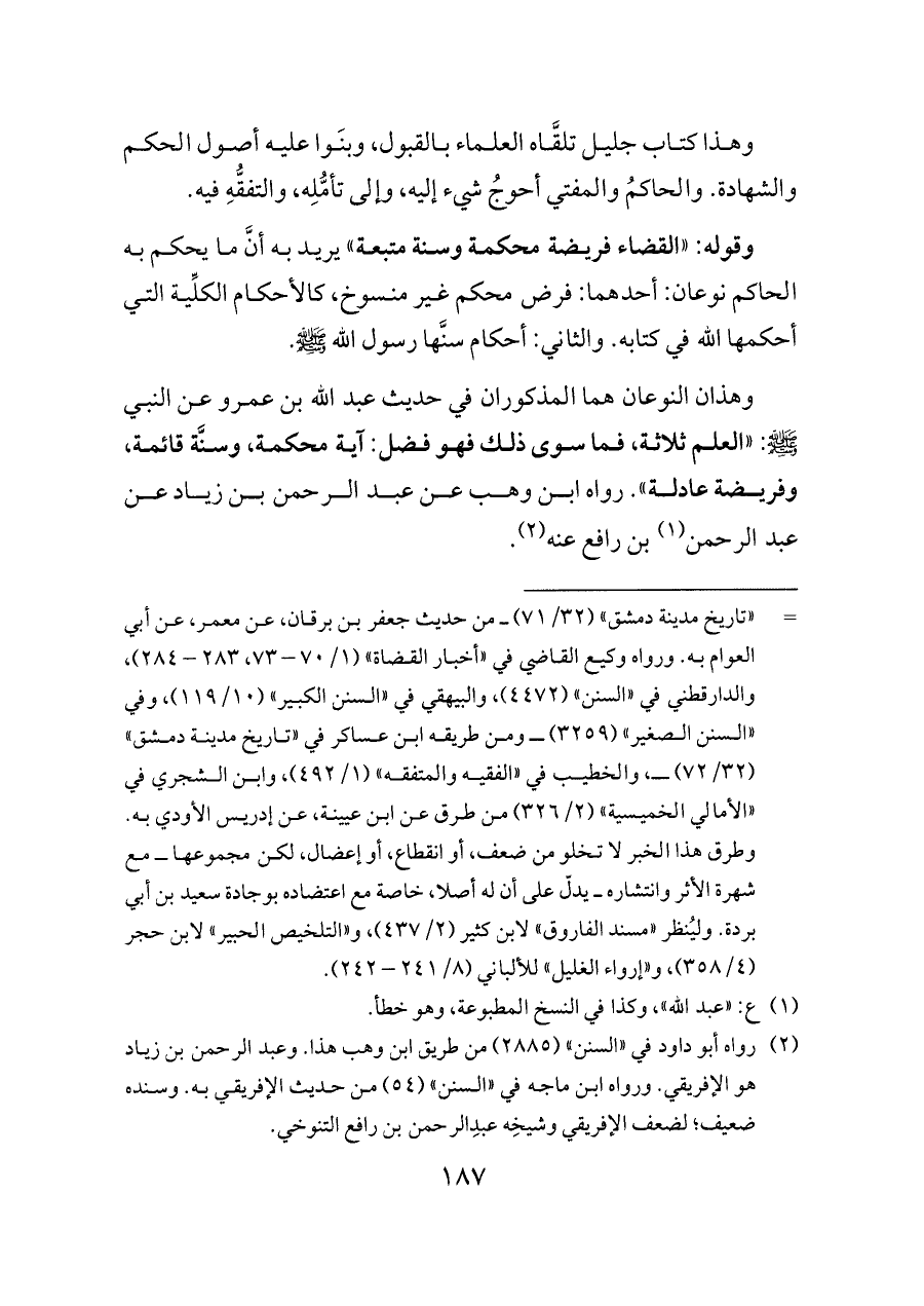وهذان النوعان هما المذكوران في حديث عبد الله بن عمرو عن النبي - صلى الله عليه وسلم -: "العلم ثلاثة، فما سوى ذلك فهو فضل: آية محكمة، وسنَّة قائمة، وفريضة عادلة". رواه ابن وهب عن عبد الرحمن بن زياد عن عبد الرحمن (¬١) بن رافع عنه (¬٢).