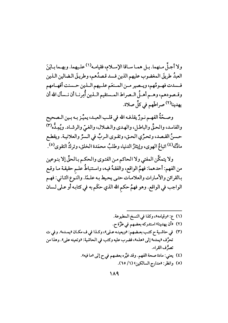 ولا أجلَّ منهما. بل هما ساقا الإسلام، فقيامه (¬١) عليهما. وبهما بايَنَ العبدُ طريقَ المغضوب عليهم الذين فسد قصدُهم، وطريقَ الضالين الذين فسدت فهومُهم، ويصير من المنعَم عليهم الذين حسنت أفهامهم وقصودهم، وهم أهلُ الصراط المستقيم الذين أُمِرنا أن نسأل الله أن يهدينا (¬٢) صراطَهم في كلِّ صلاة.