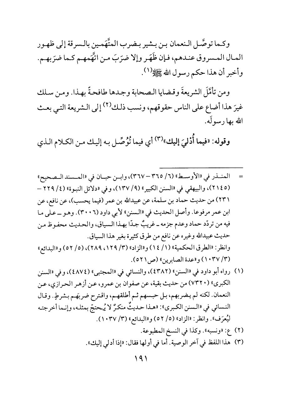 وكما توصَّل النعمان بن بشير بضرب المتَّهَمين بالسرقة إلى ظهور المال المسروق عندهم، فإن ظَهَر وإلا ضرَبَ من اتَّهَمهم كما ضرَبهم. وأخبر أن هذا حكم رسول الله - صلى الله عليه وسلم - (¬١).