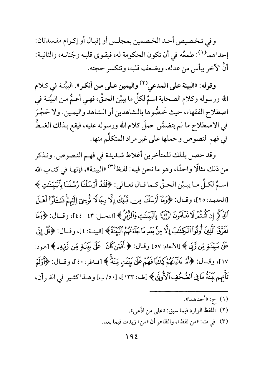 وقد حصل بذلك للمتأخرين أغلاط شديدة في فهم النصوص. ونذكر من ذلك مثالًا واحدًا، وهو ما نحن فيه: لفظ (¬٣) "البينة"، فإنها في كتاب الله اسمٌ لكلِّ ما يبيِّن الحقَّ كما قال تعالى: {لَقَدْ أَرْسَلْنَا رُسُلَنَا بِالْبَيِّنَاتِ} [الحديد: ٢٥]، وقال: {وَمَا أَرْسَلْنَا مِنْ قَبْلِكَ إِلَّا رِجَالًا نُوحِي إِلَيْهِمْ فَاسْأَلُوا أَهْلَ الذِّكْرِ إِنْ كُنْتُمْ لَا تَعْلَمُونَ (٤٣) بِالْبَيِّنَاتِ وَالزُّبُرِ} [النحل: ٤٣ - ٤٤]، وقال: {وَمَا تَفَرَّقَ الَّذِينَ أُوتُوا الْكِتَابَ إِلَّا مِنْ بَعْدِ مَا جَاءَتْهُمُ الْبَيِّنَةُ} [البينة: ٤]، وقال: {قُلْ إِنِّي عَلَى بَيِّنَةٍ مِنْ رَبِّي} [الأنعام: ٥٧] وقال: {أَفَمَنْ كَانَ عَلَى بَيِّنَةٍ مِنْ رَبِّهِ} [هود: ١٧]، وقال: {أَمْ آتَيْنَاهُمْ كِتَابًا فَهُمْ عَلَى بَيِّنَتٍ مِنْهُ} [فاطر: ٤٠]، وقال: {أَوَلَمْ تَأْتِهِمْ بَيِّنَةُ مَا فِي الصُّحُفِ الْأُولَى} [طه: ١٣٣]، [٥٠/ب] وهذا كثير في القرآن،